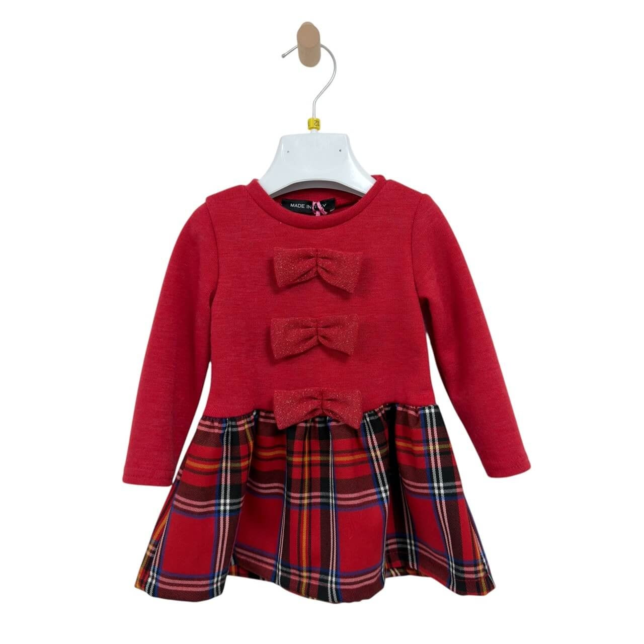 Un delizioso abitino pensato per le più piccole, caratterizzato da un corpino morbido e confortevole arricchito da tre fiocchetti applicati sul davanti. La gonna presenta una fantasia a quadri elegante e senza tempo, ideale per creare un look raffinato e adatto a ogni occasione.