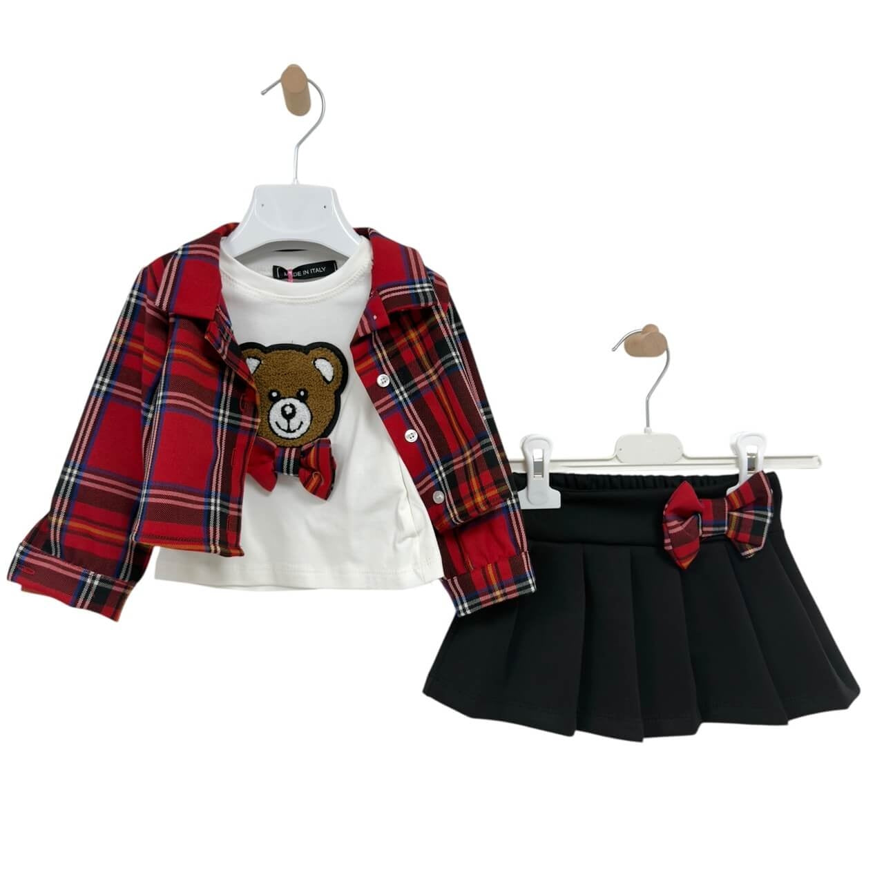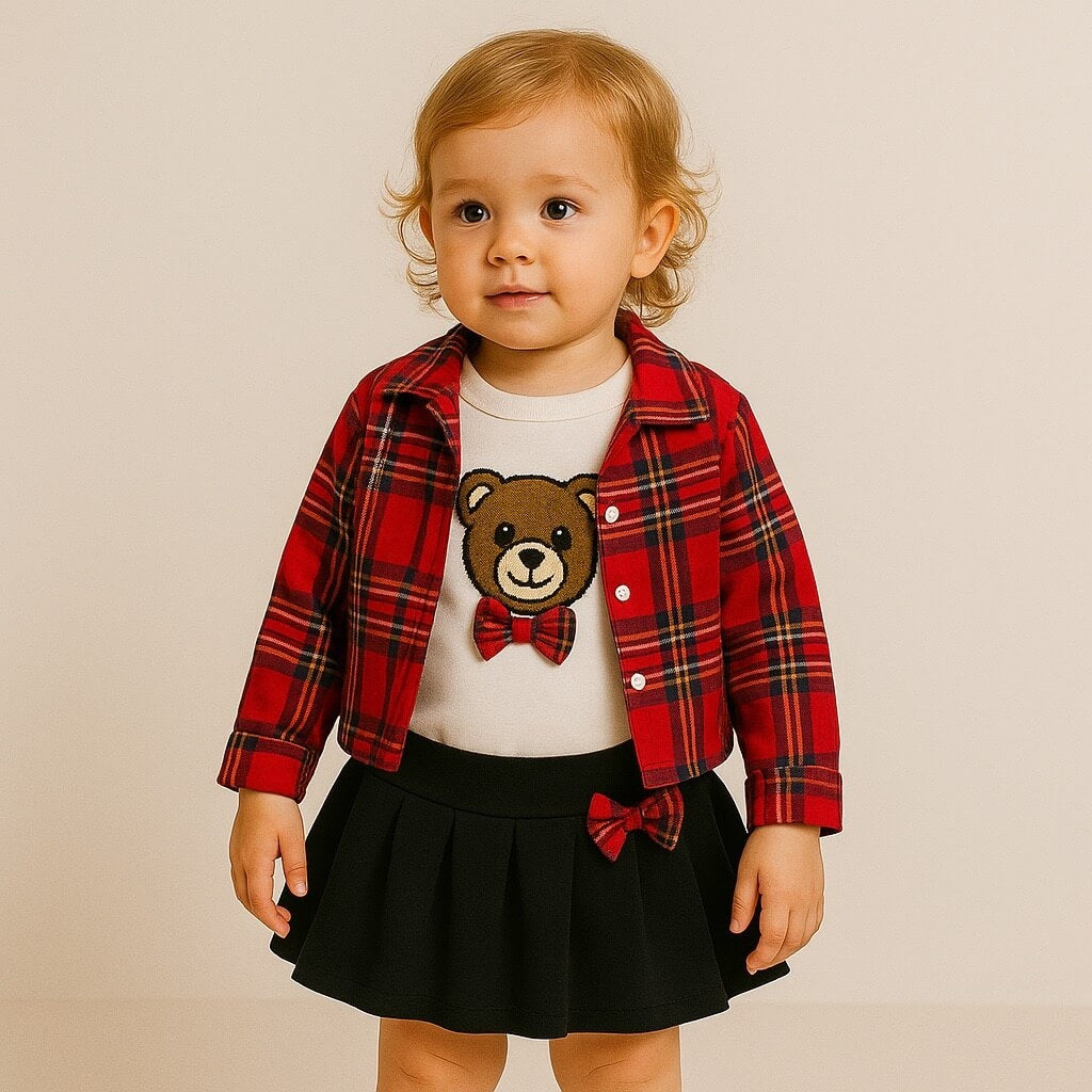 Delizioso coordinato composto da giacca con fantasia, maglia con dolce ricamo orsetto e fiocco applicato, e gonnellina abbinata. Un outfit perfetto per donare un tocco di eleganza e tenerezza alle giornate della tua bimba. Realizzato con materiali morbidi e di qualità, garantisce comfort e stile in ogni occasione.
