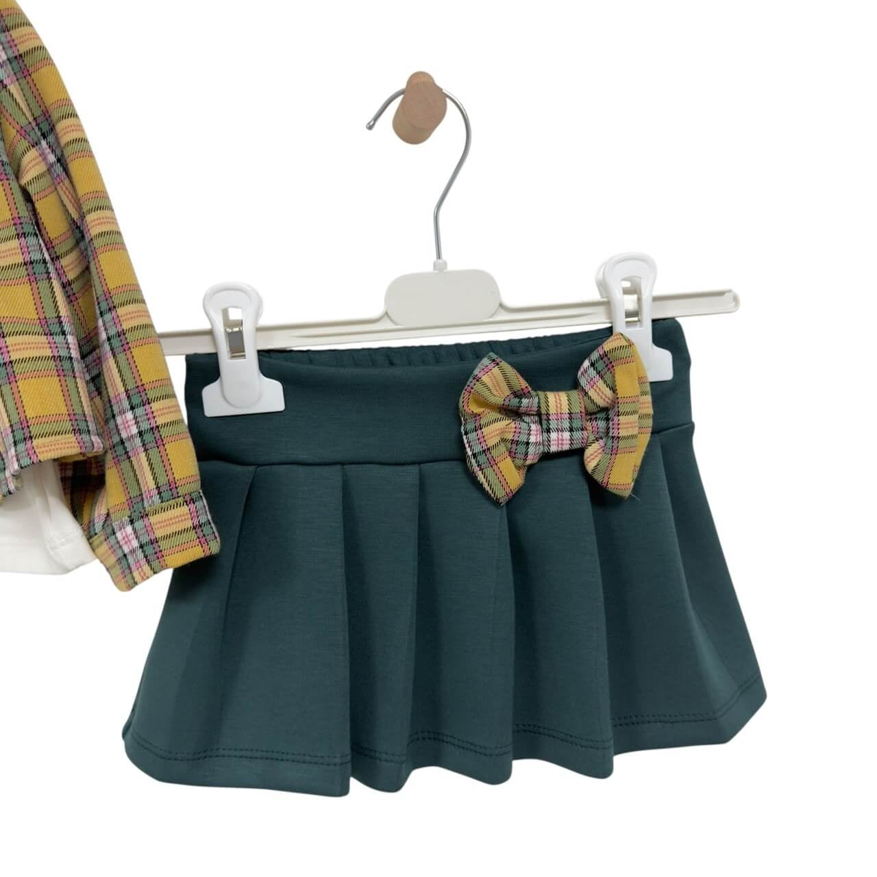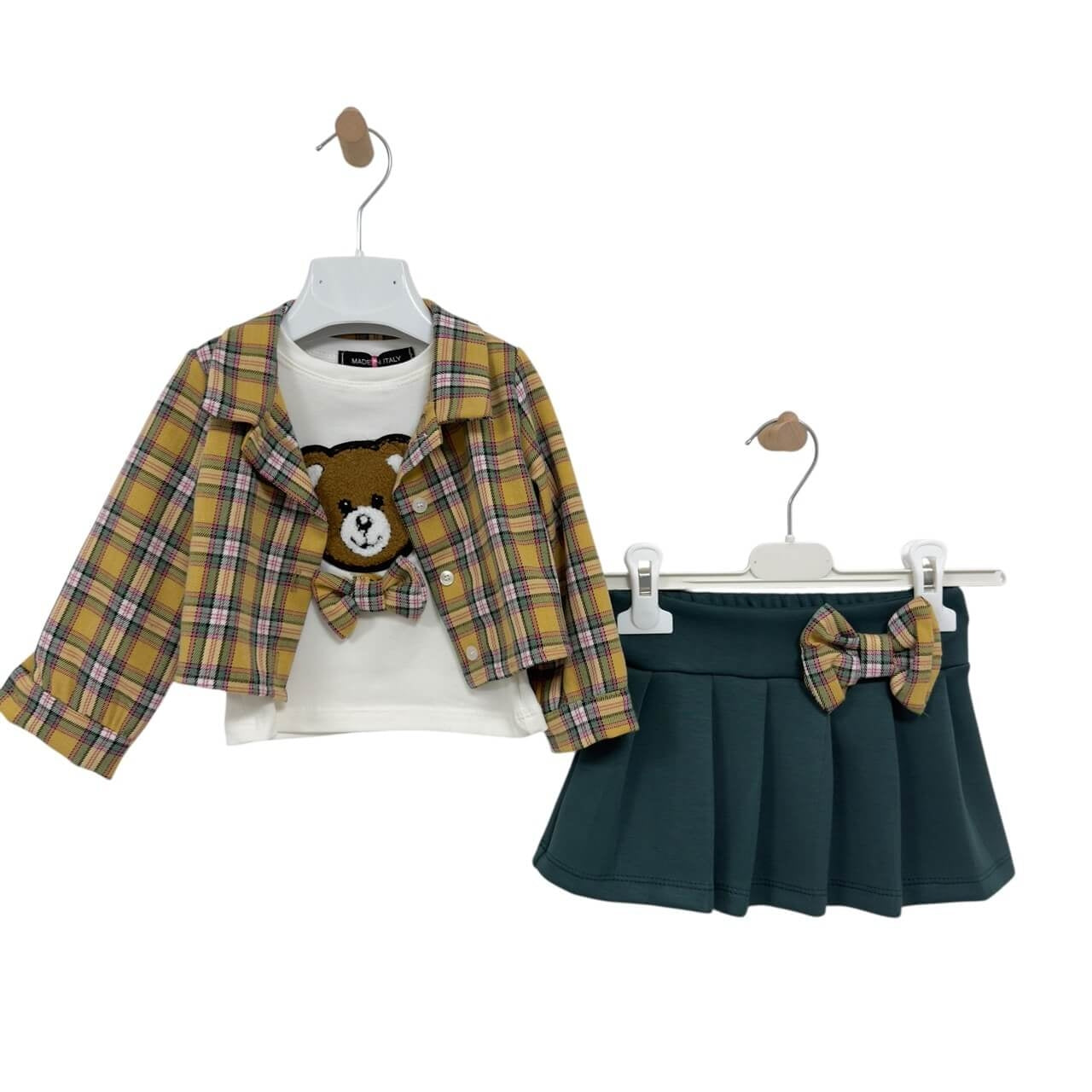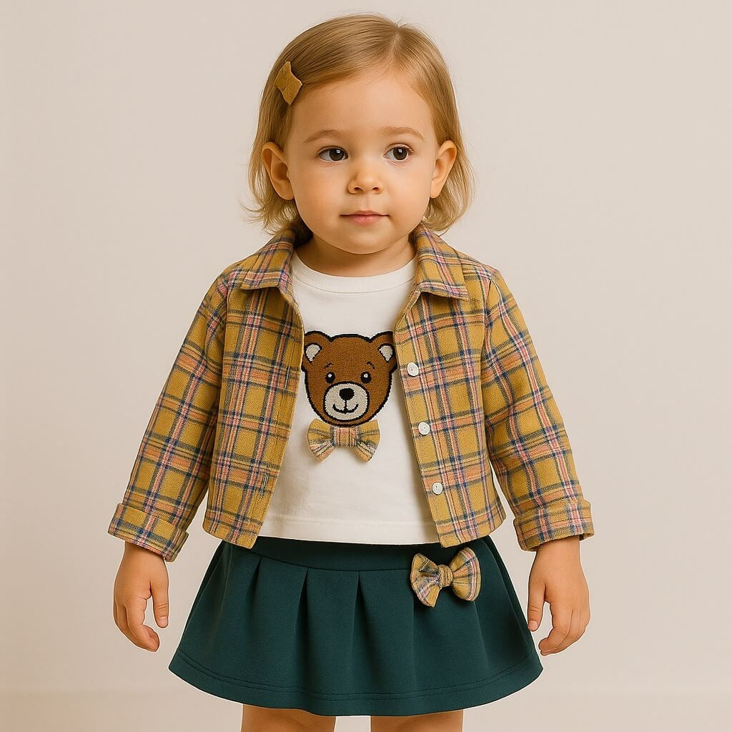 Delizioso coordinato composto da giacca con fantasia, maglia con dolce ricamo orsetto e fiocco applicato, e gonnellina abbinata. Un outfit perfetto per donare un tocco di eleganza e tenerezza alle giornate della tua bimba. Realizzato con materiali morbidi e di qualità, garantisce comfort e stile in ogni occasione.