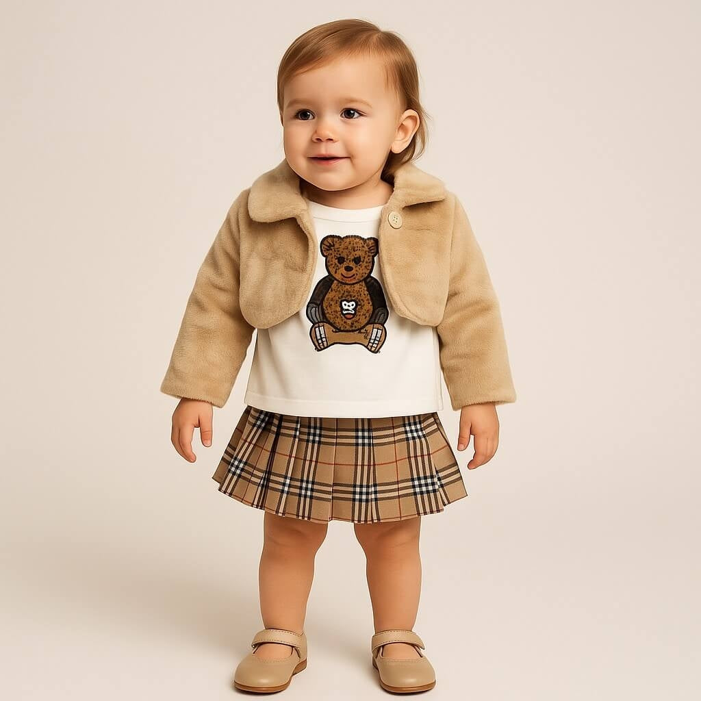 Delizioso coordinato composto da Pelliccia , maglia con dolce ricamo orsetto e fiocco applicato, e gonnellina abbinata. Un outfit perfetto per donare un tocco di eleganza e tenerezza alle giornate della tua bimba. Realizzato con materiali morbidi e di qualità, garantisce comfort e stile in ogni occasione.