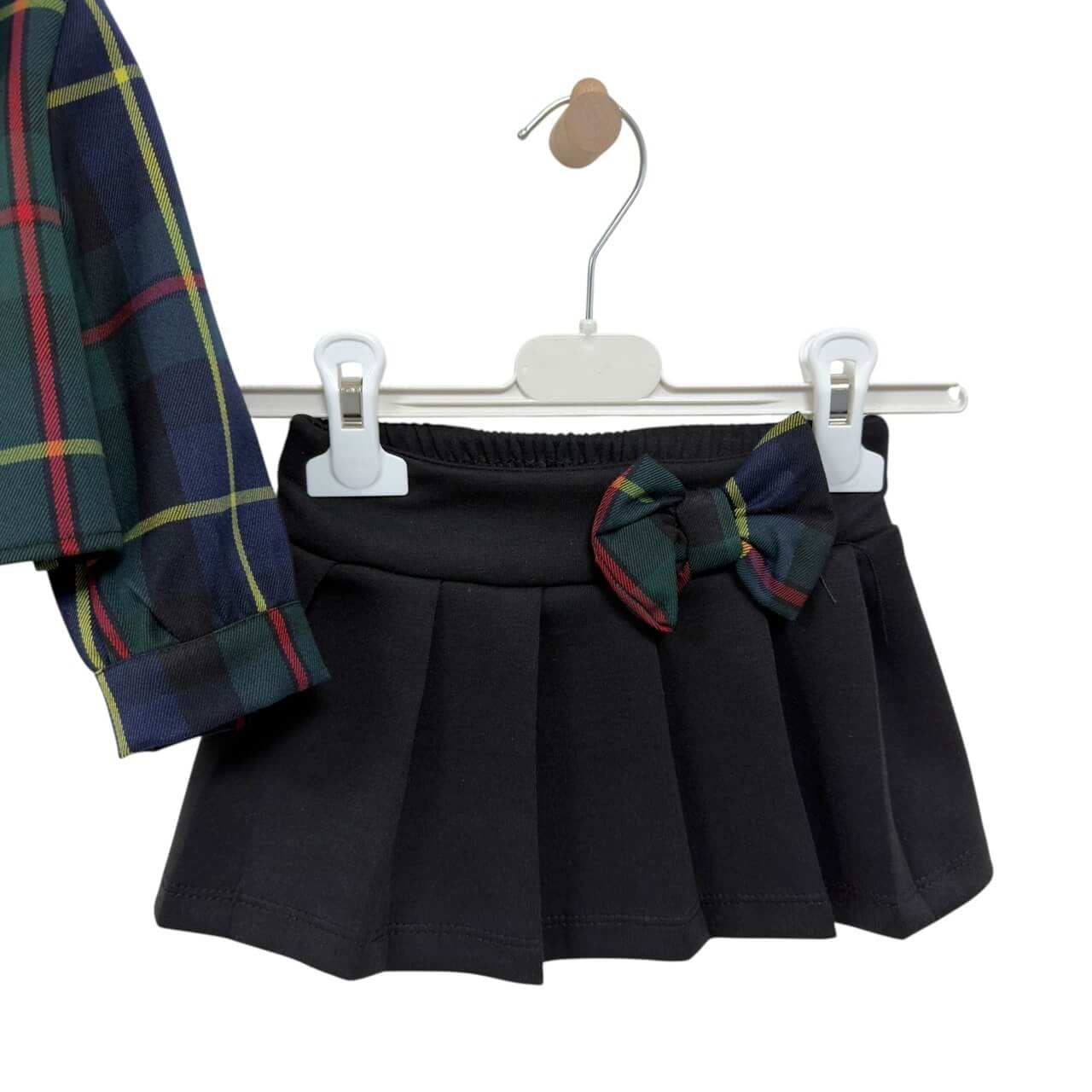 Delizioso completo da bambina composto da tre pezzi coordinati: giacca corta a maniche lunghe, t-shirt con applicazione a orsetto e graziosa gonna plissettata con fiocco abbinato.