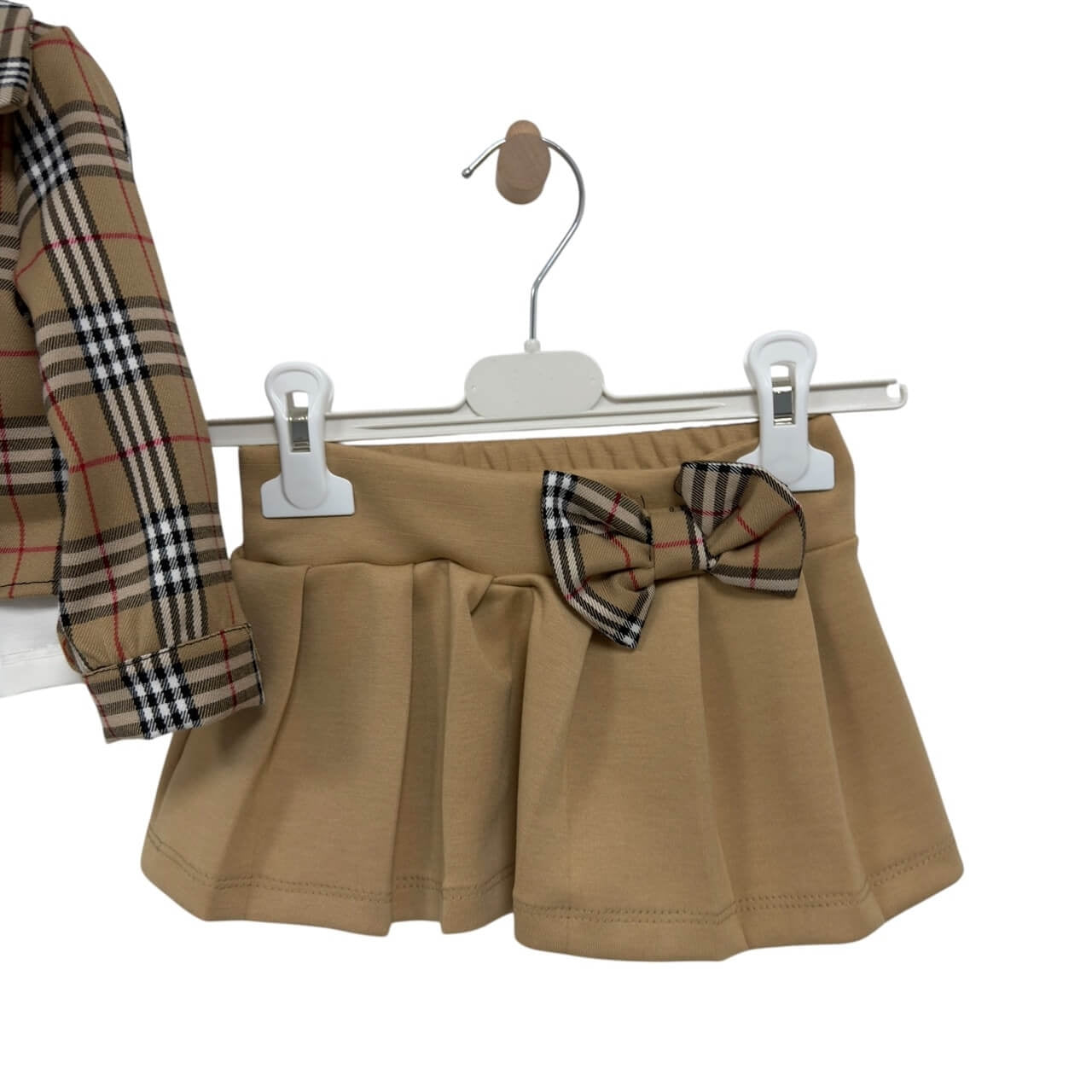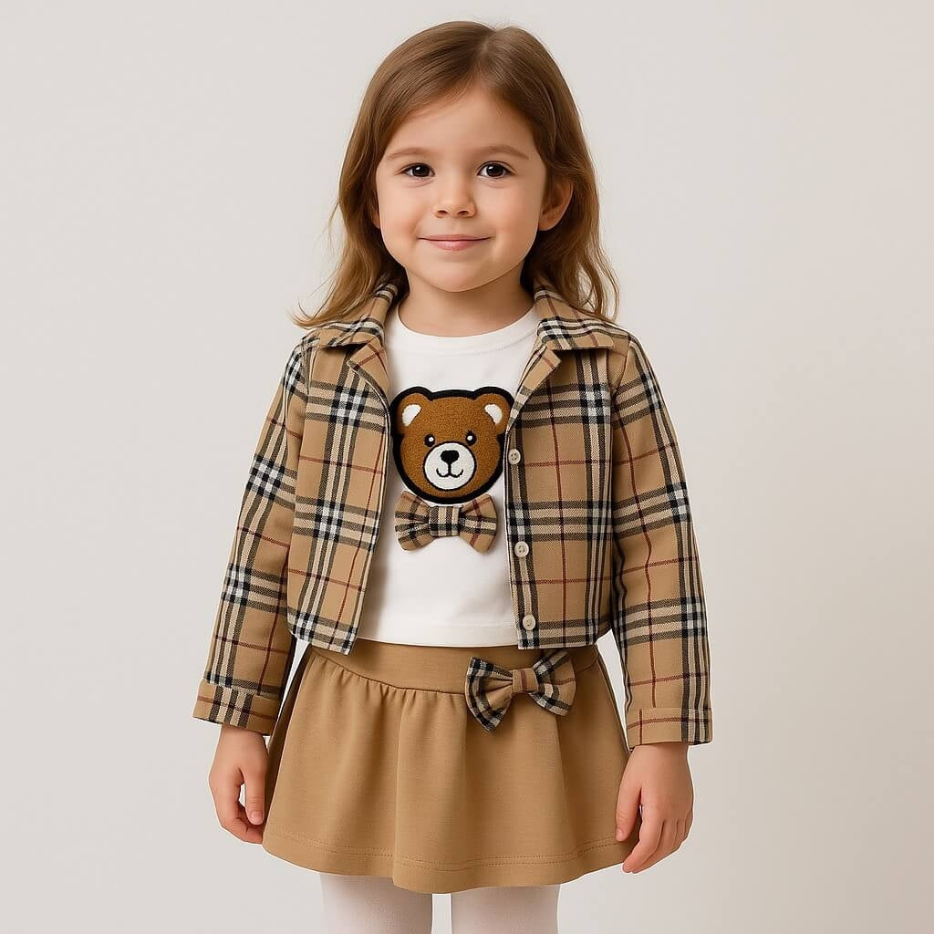 Delizioso completo da bambina composto da tre pezzi coordinati: giacca corta a maniche lunghe, t-shirt con applicazione a orsetto e graziosa gonna plissettata con fiocco abbinato.