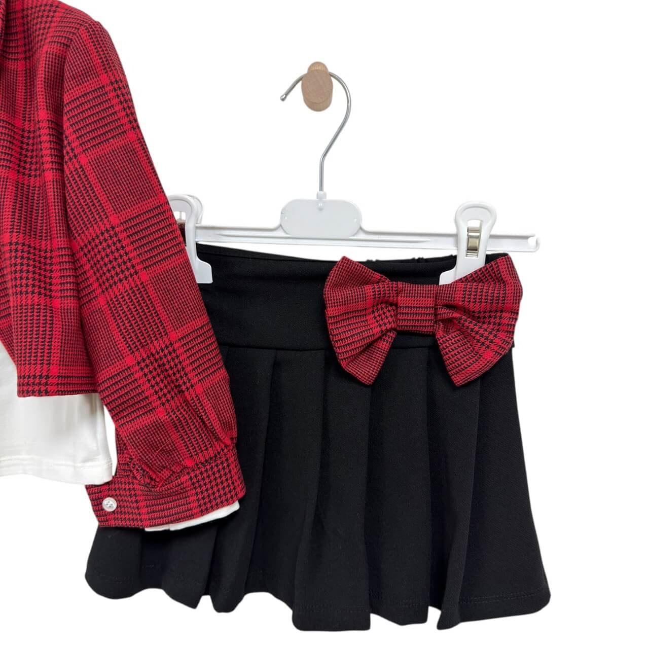 Delizioso completo da bambina composto da tre pezzi coordinati: giacca corta a maniche lunghe, t-shirt con applicazione a orsetto e graziosa gonna plissettata con fiocco abbinato.