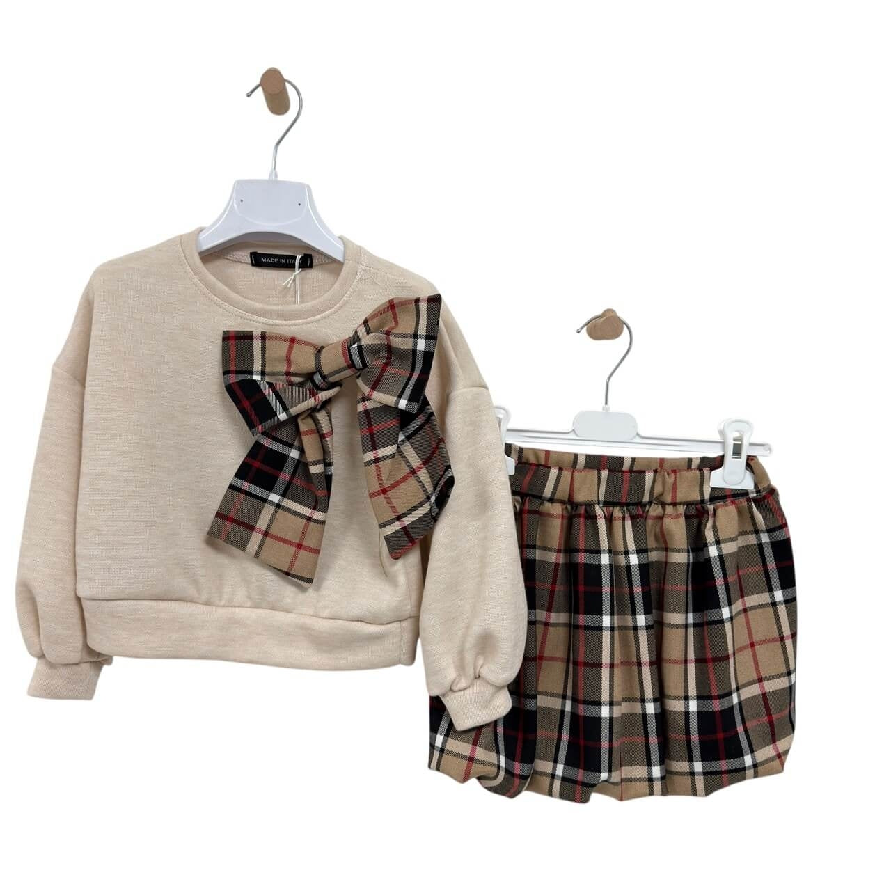 Completo bambina Nikka Nature – Maglia con maxi fiocco e gonna a pieghe