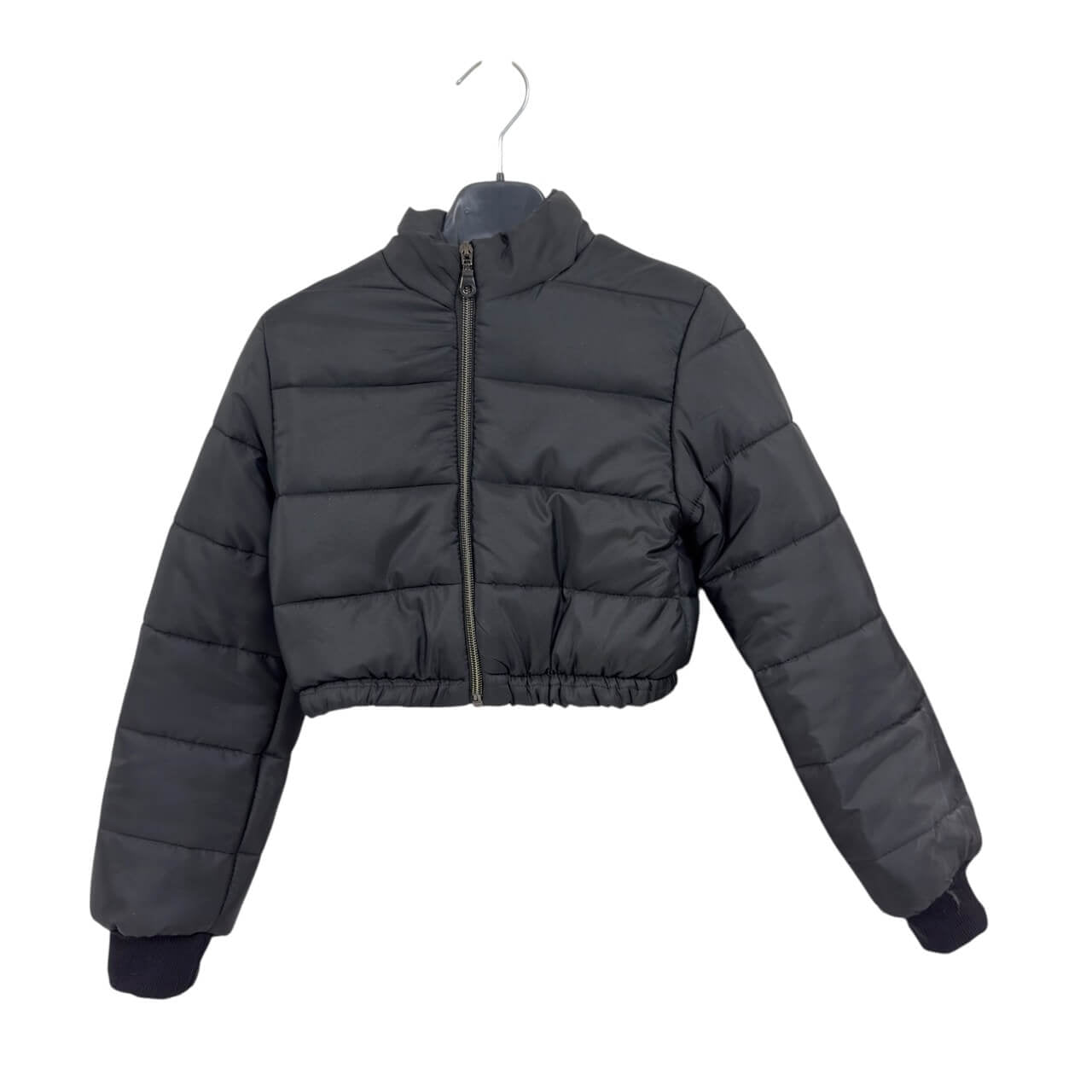 Giubbino corto imbottito in ecopelle color beige con zip frontale, polsini neri a costine ed elastico sul fondo per una vestibilità confortevole e alla moda.