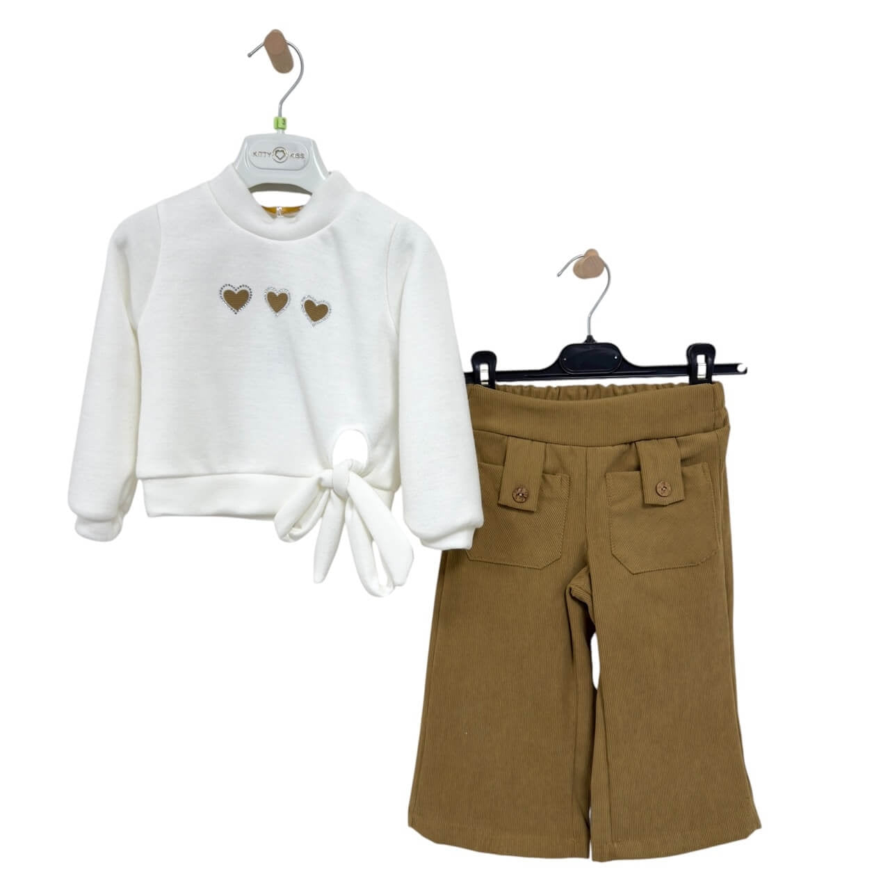 Il set è composto da una felpa color panna con tre cuoricini applicati sul petto in tinta cammello e un elegante nodo laterale che dona un tocco di stile.