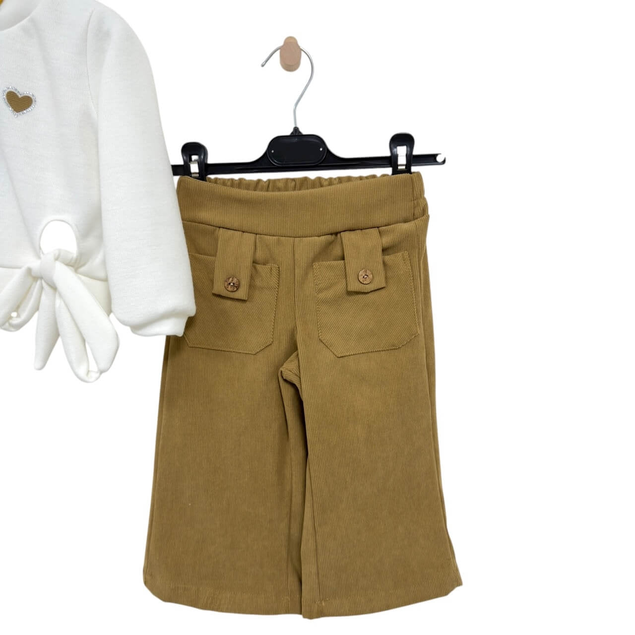 Il pantalone in velluto millerighe color caramello presenta tasche posteriori e bottoni decorativi, garantendo comfort e raffinatezza.
