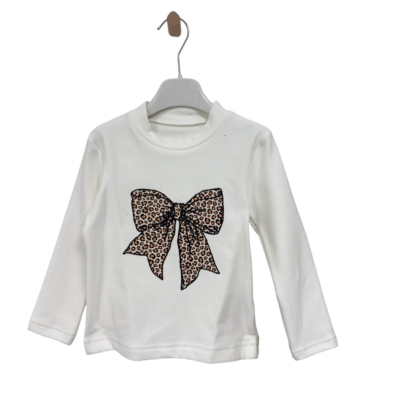 • Maglia panna a maniche lunghe con maxi fiocco stampato in fantasia animalier leopardata sul davanti.