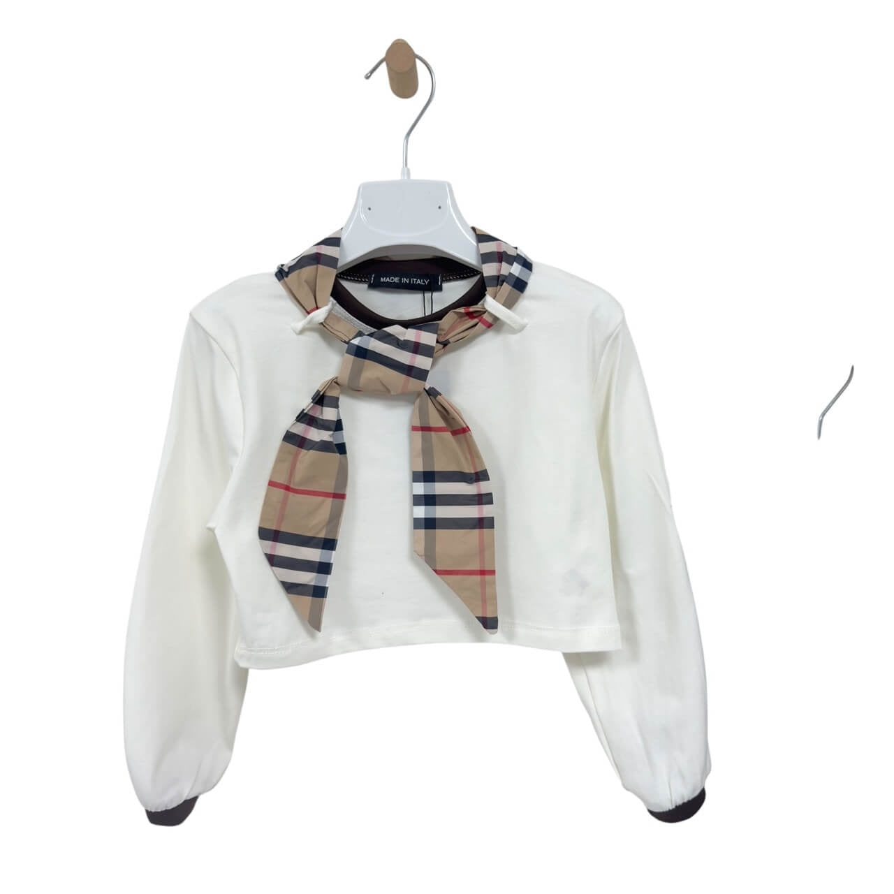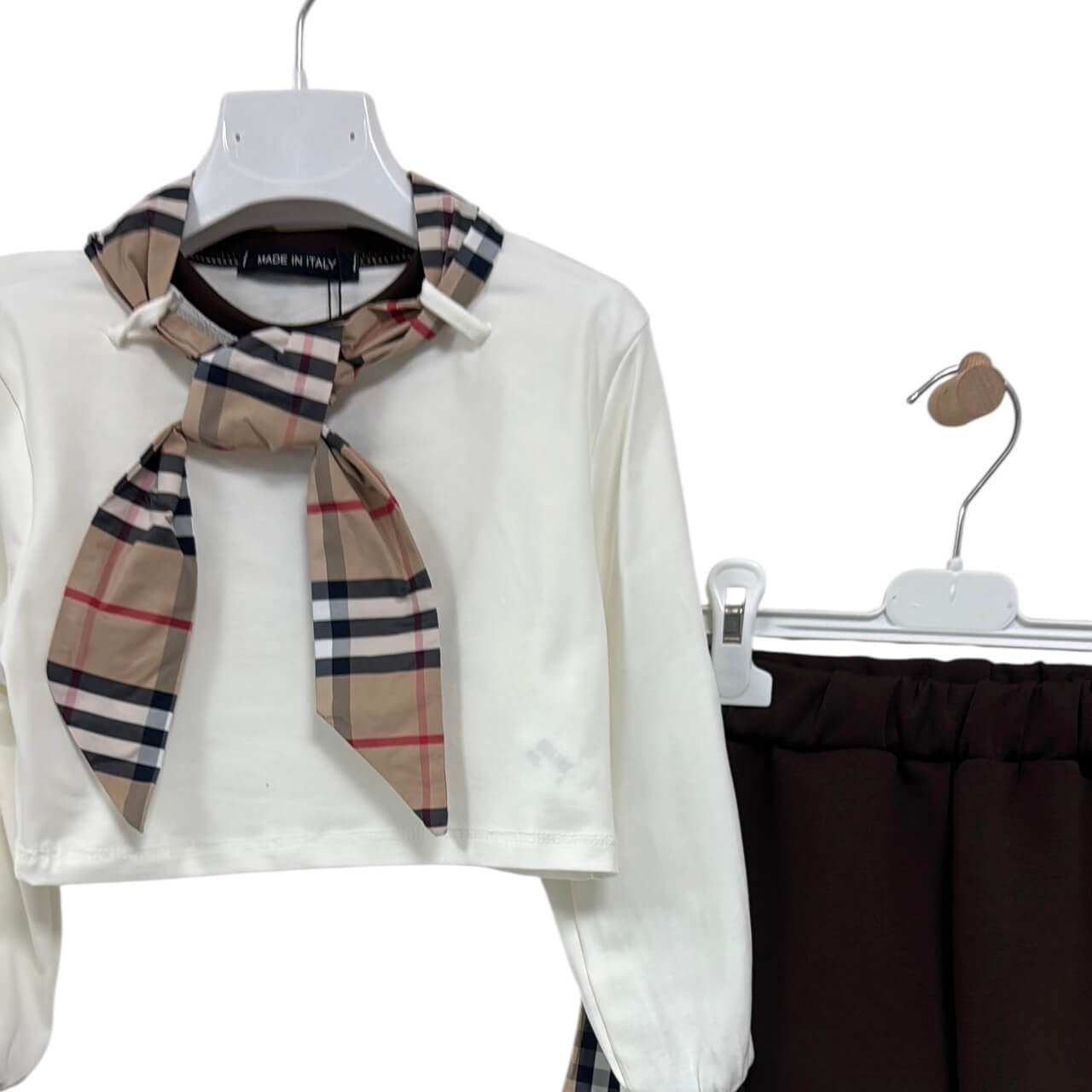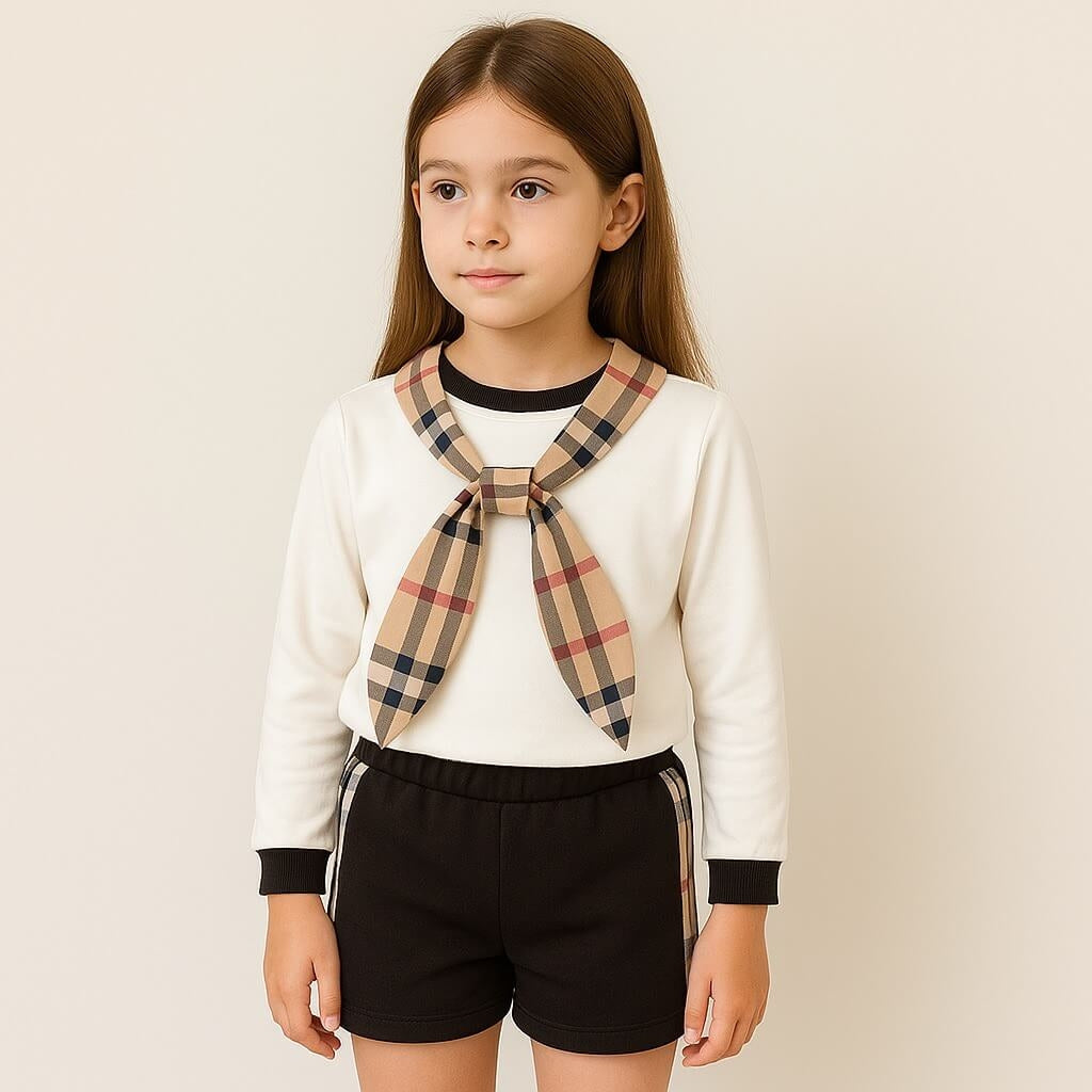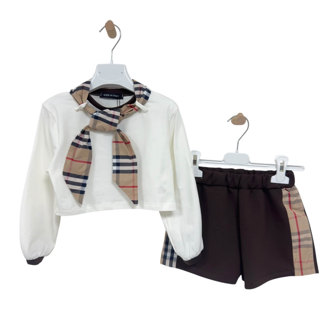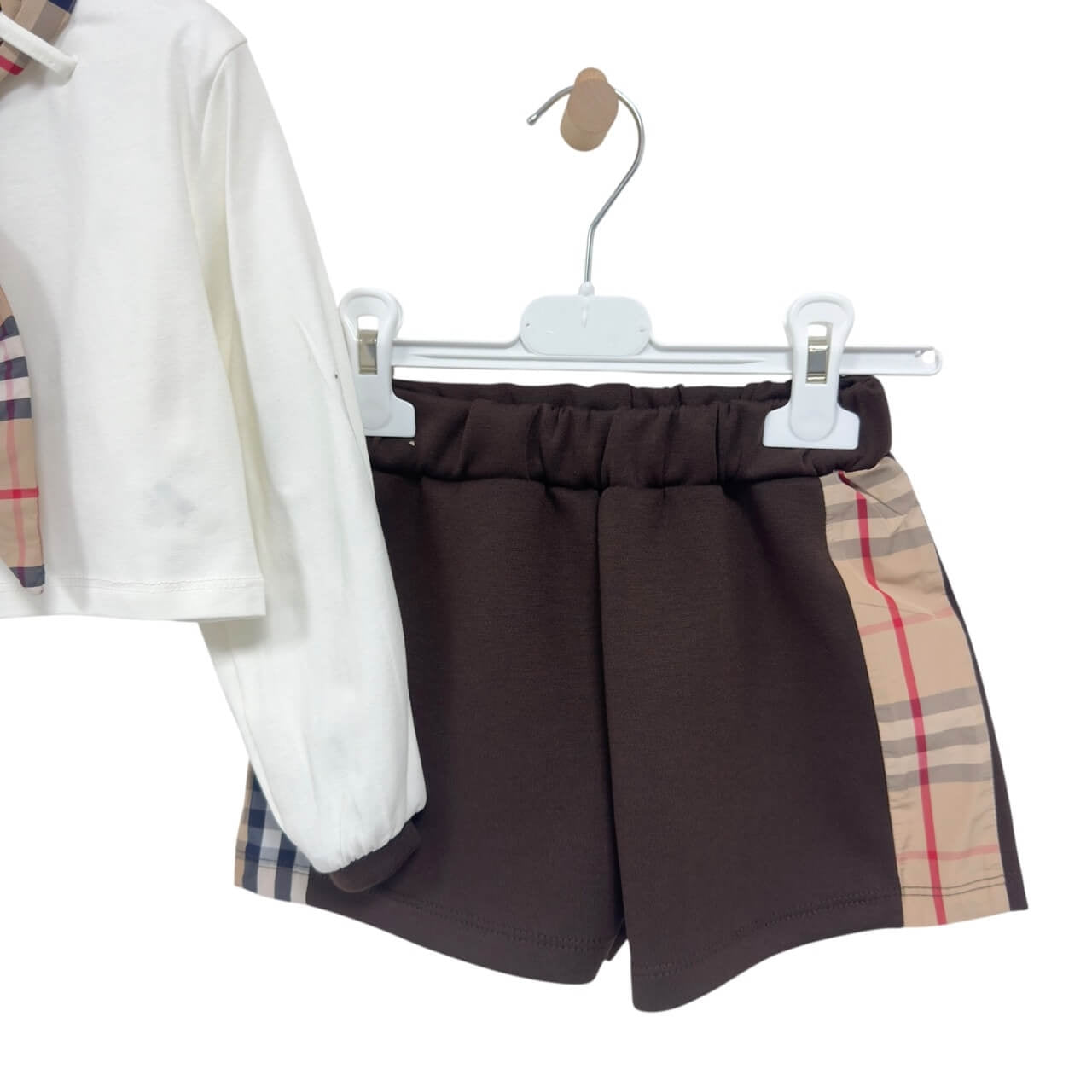 Completo Bimba composto da maglia a manica lunga con elegante dettaglio a fiocco e pantaloncini abbinati. Il design presenta inserti con fantasia a quadri e polsini a contrasto per un tocco raffinato e moderno. Realizzato in morbido cotone, assicura comfort e libertà di movimento per tutto il giorno.