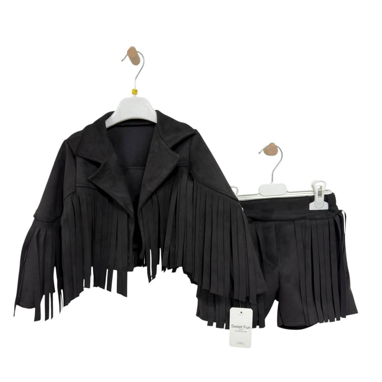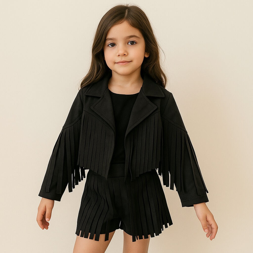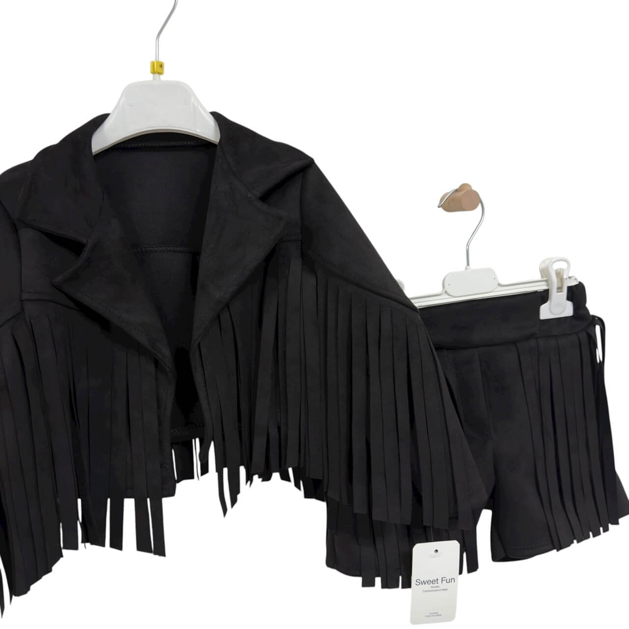 Completo bambina composto da Giacca in camoscio con frange + shorts in camoscio con frange.