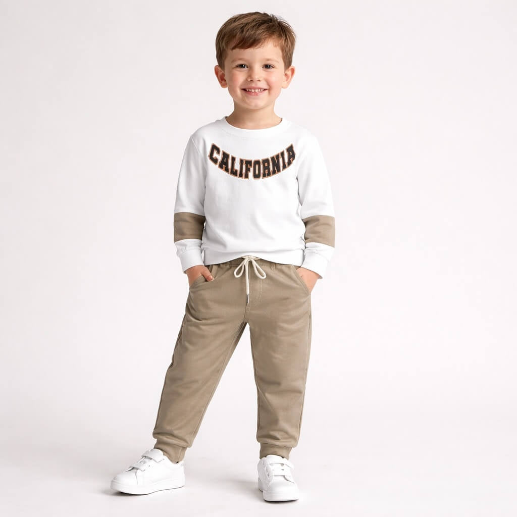 Comodo e alla moda, questo completo in cotone Made in Italy firmato Monello è pensato per garantire libertà di movimento e comfort durante tutta la giornata. La felpa a maniche lunghe con Stampa applicato e il pantalone a tuta offrono praticità e un look moderno, ideale per la scuola, il tempo libero e le giornate più fresche.