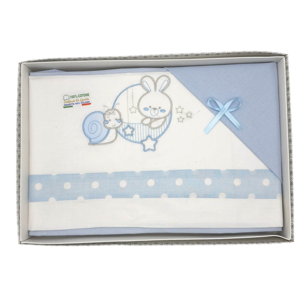 Colorato completo in puro cotone, misura adatta alla culla o alla carrozzina, ricamato con deliziosi soggetti.