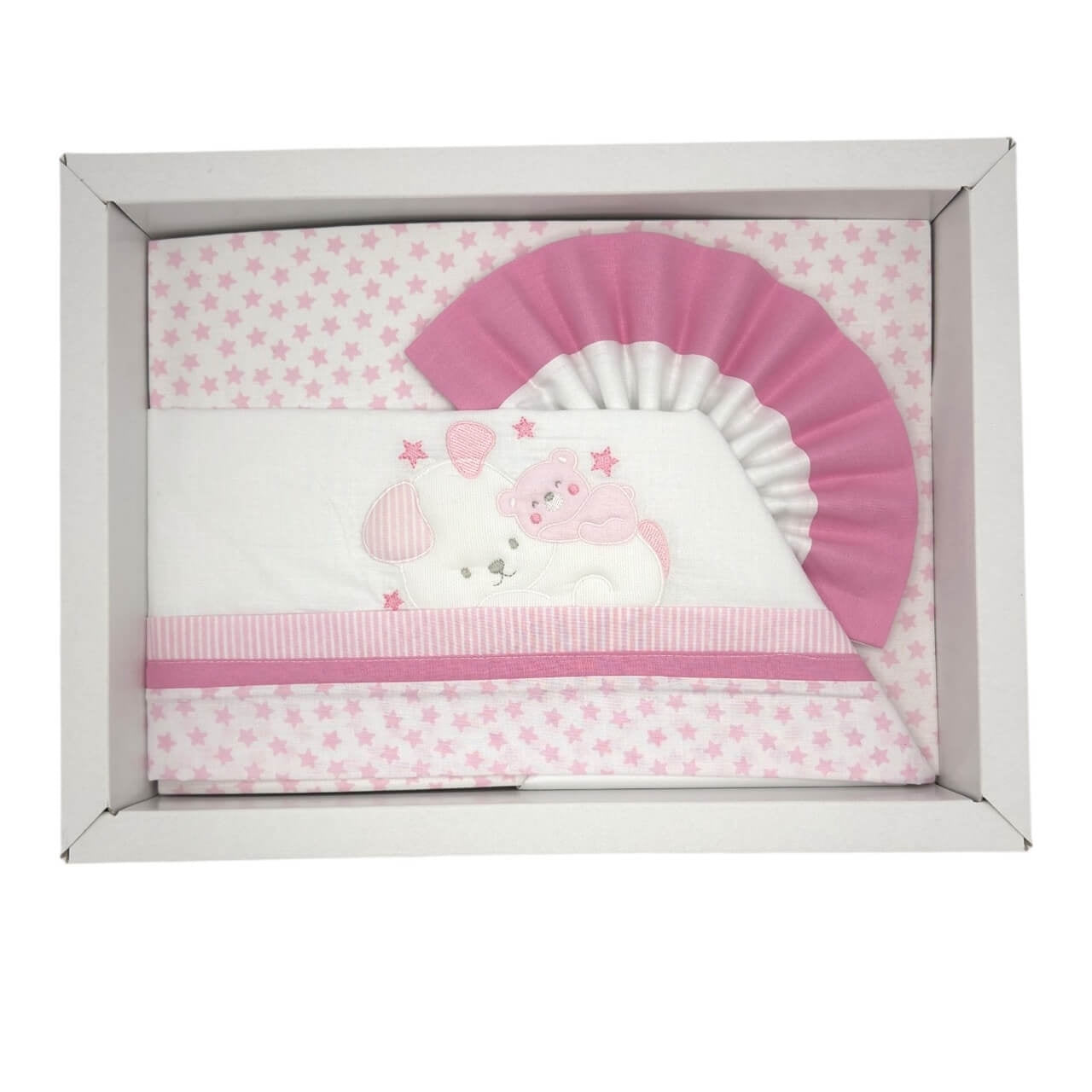 Comprende il lenzuolo di sotto (70x35 cm), il lenzuolo di sopra (80x120 cm) ed una federa (27x37 cm).