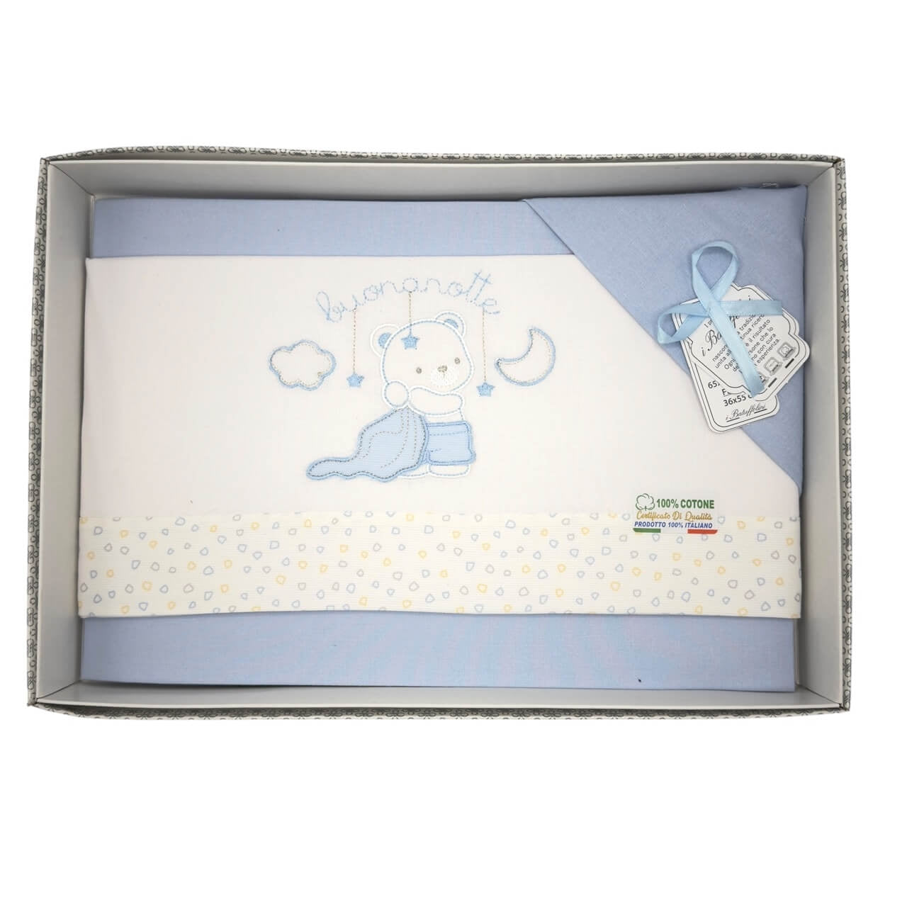 Comprende il lenzuolo di sotto (130x65x18 cm), il lenzuolo di sopra (180x120 cm) ed una federa