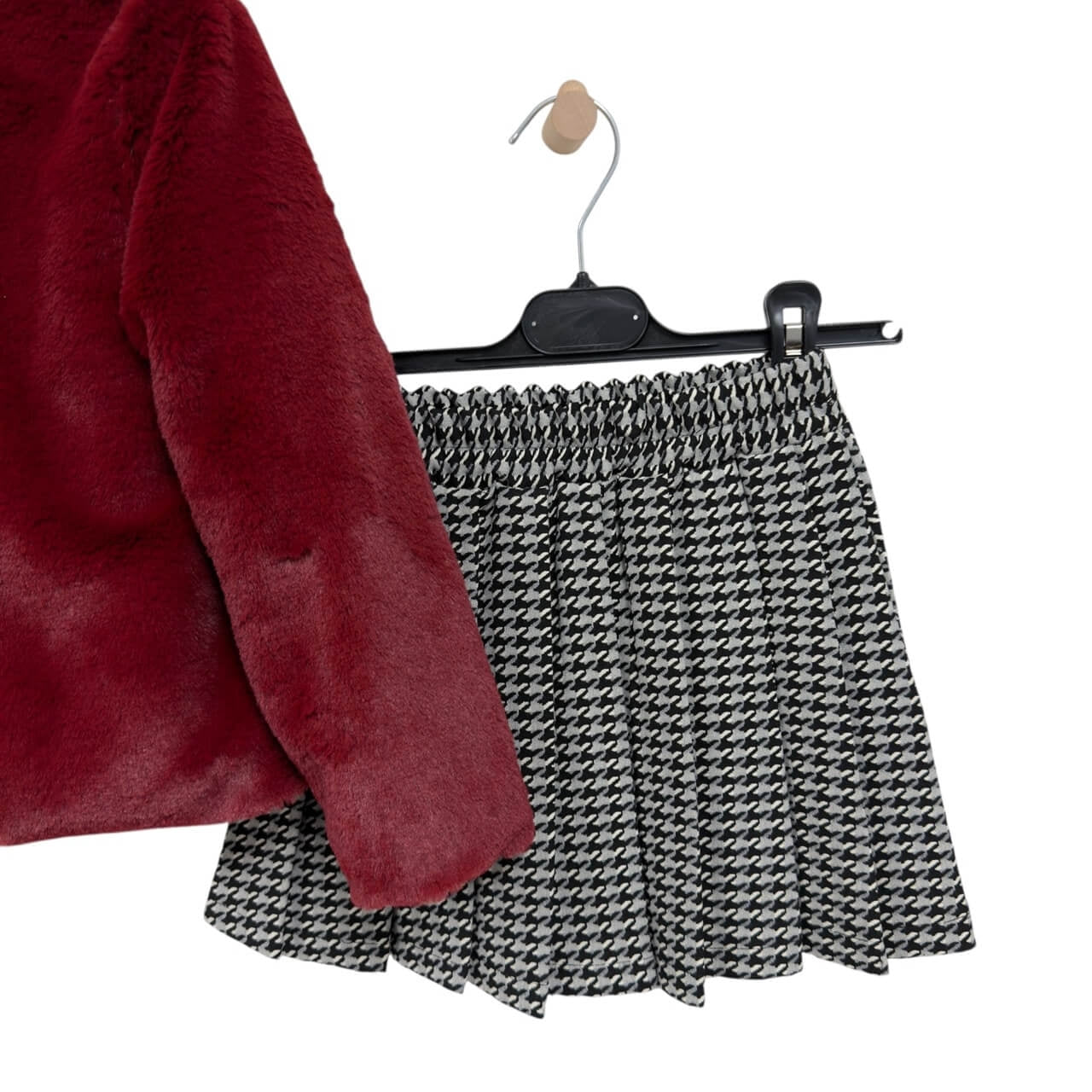 Un elegante completo composto da morbido giacchino in pelliccia ecologica, dolcevita in caldo cotone e gonna svasata a fantasia. Un look raffinato e confortevole, ideale per le giornate più fresche e le occasioni speciali. Lo stile ricercato e i dettagli curati rendono questo outfit perfetto per ogni piccola fashionista.