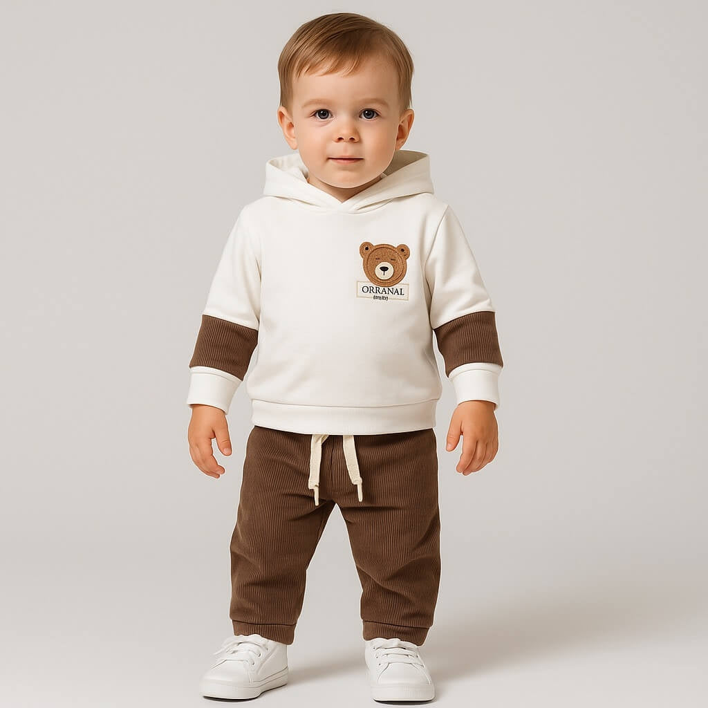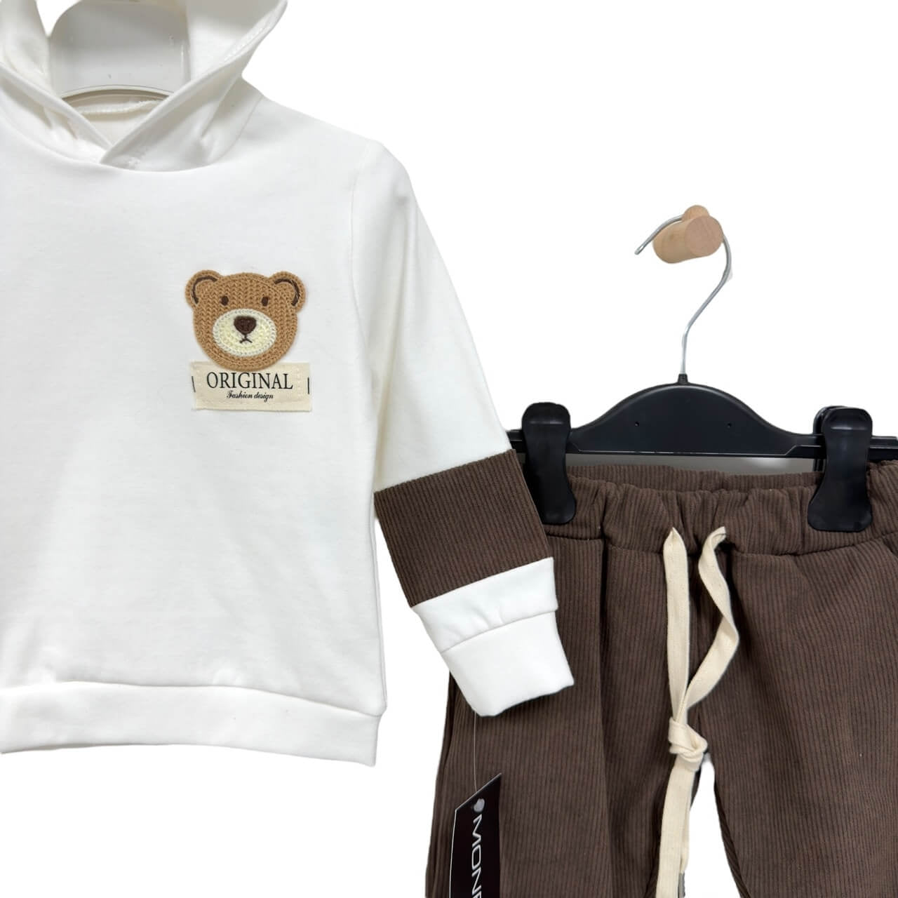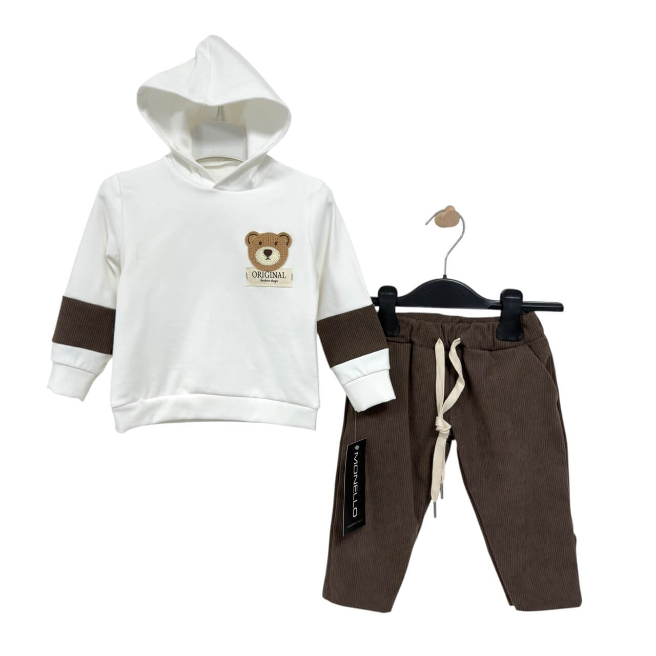 • Felpa bianca con cappuccio, arricchita da patch orsetto ricamato e dettagli a contrasto color marrone sulle maniche.