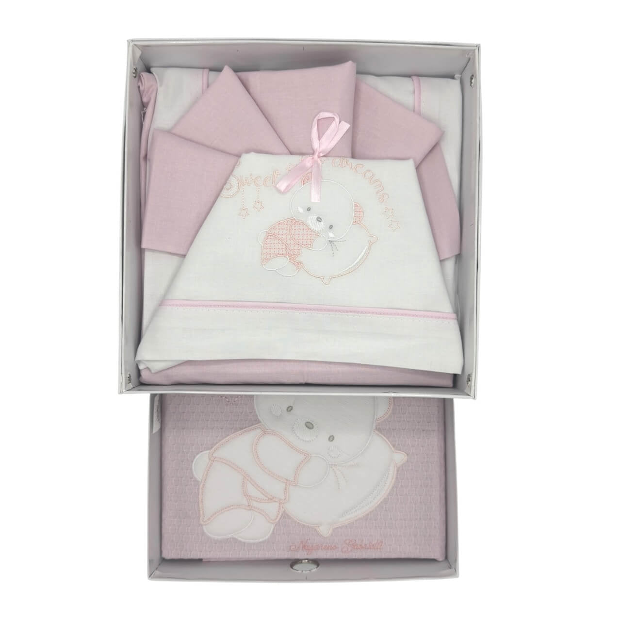 Colorato completo in puro cotone con copertina in cotone abbinato, misura adatta alla culla o alla carrozzina, ricamato con deliziosi soggetti.