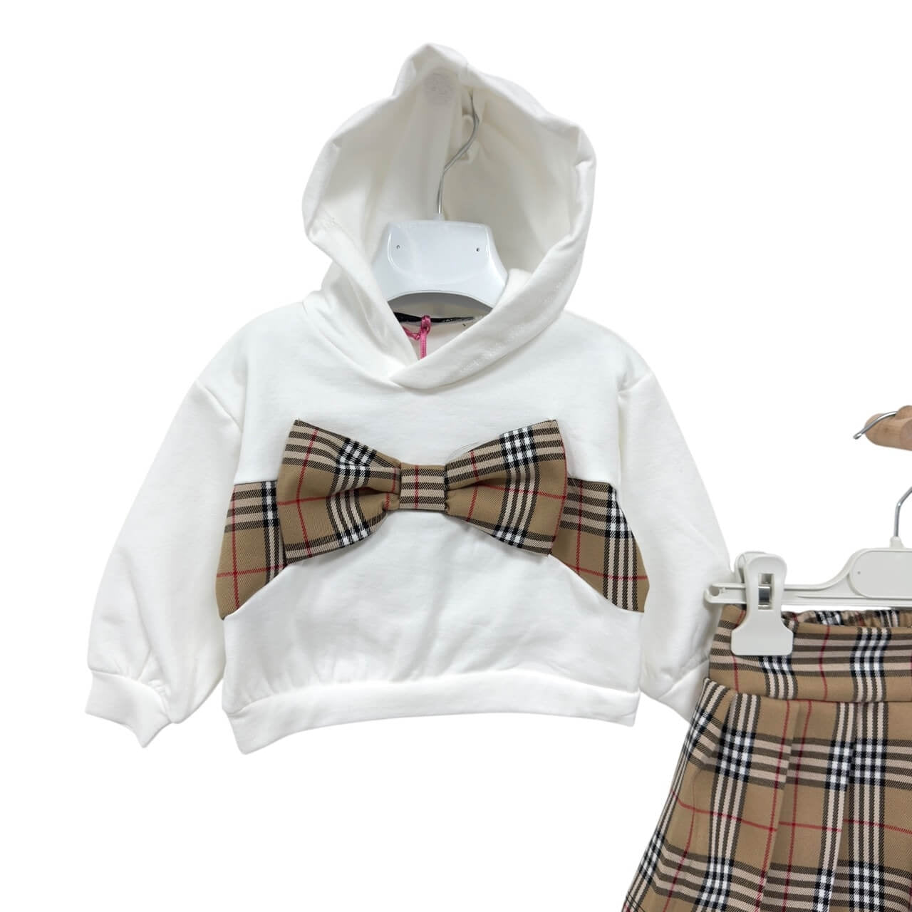Completo elegante e confortevole firmato Nikka Nature, perfetto per la stagione invernale. Il set include una felpa bianca con cappuccio, impreziosita da un grande fiocco applicato con fantasia scozzese, e una gonna a pieghe coordinata nello stesso motivo. Realizzato con materiali morbidi e di qualità, assicura comfort e stile per ogni occasione.