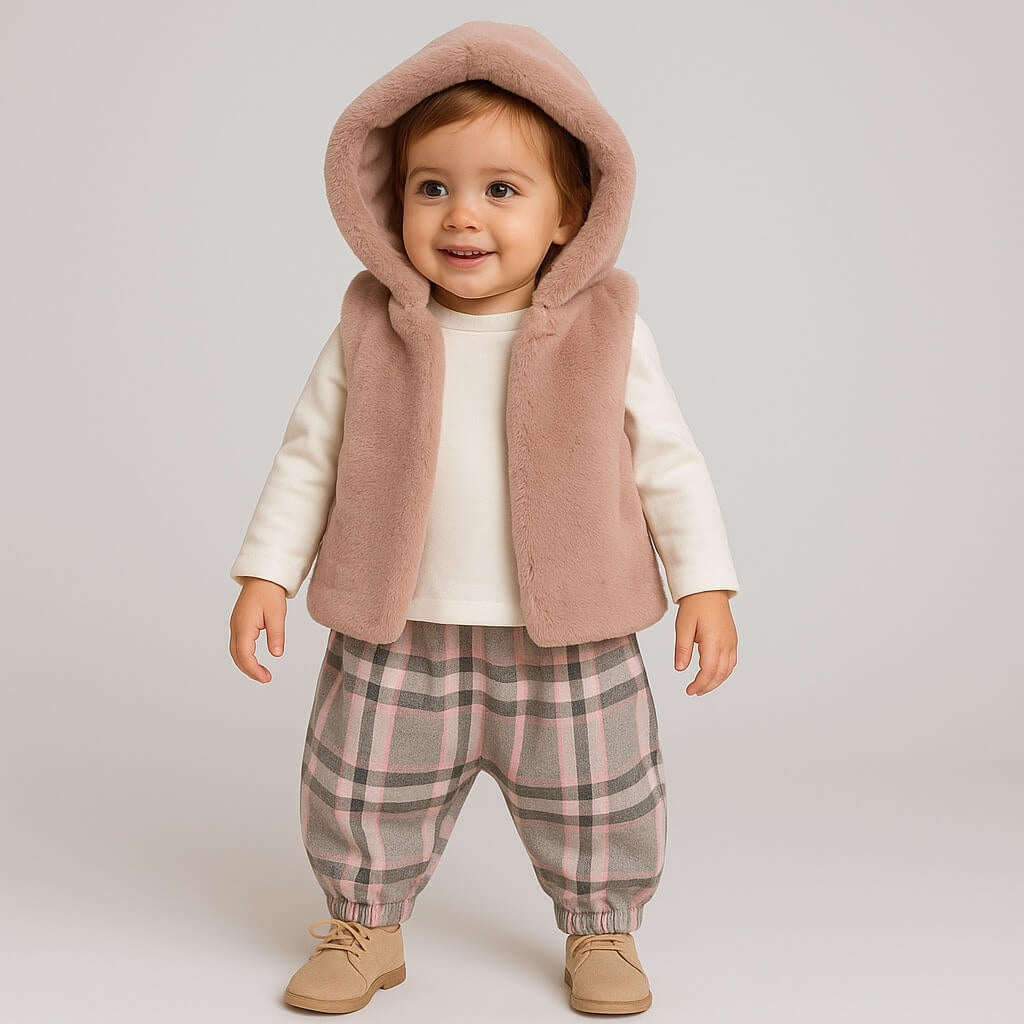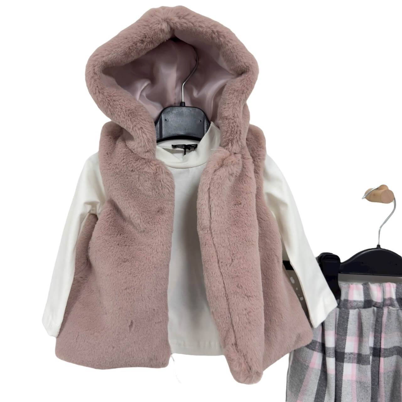Gilet in eco-pelliccia bianca con cappuccio, soffice e avvolgente, ideale per dare un tocco elegante e proteggere dal freddo.