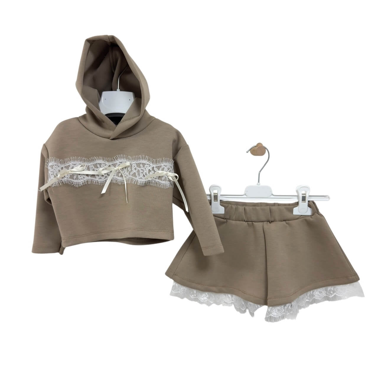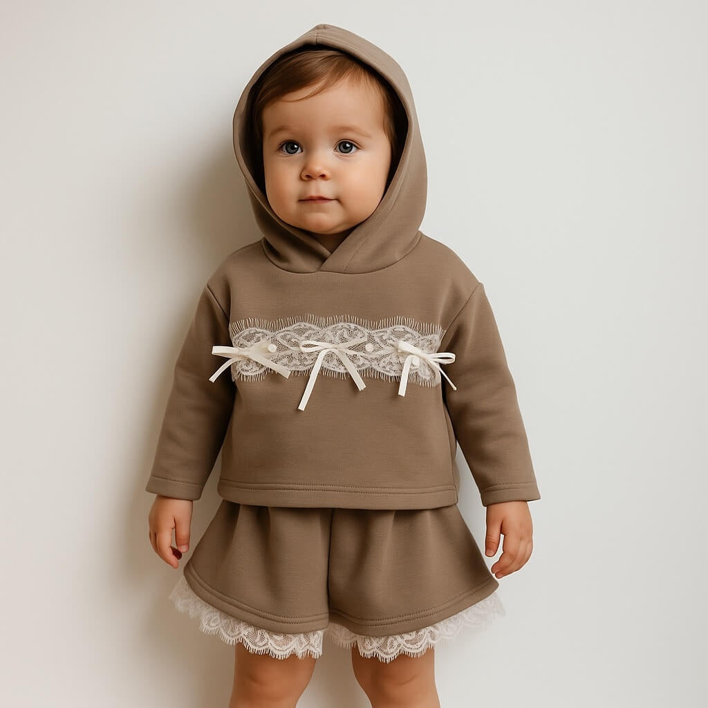 • Felpa con cappuccio decorata con inserto in pizzo e fiocchetti applicati