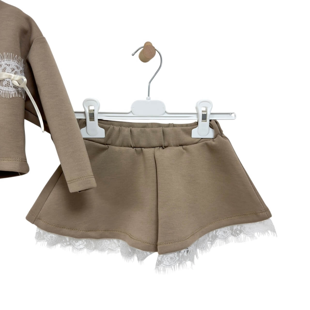 • Gonna-pantaloncino con elastico in vita e dettaglio in pizzo sul bordo