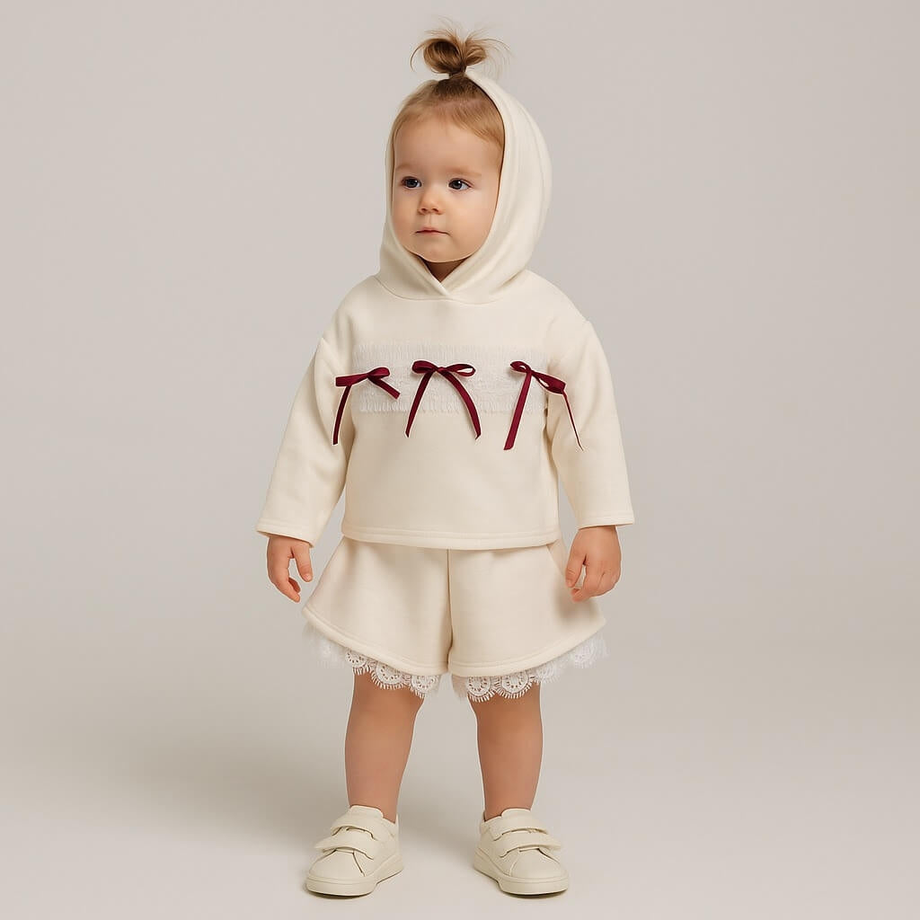 Felpa con cappuccio decorata con inserto in pizzo e fiocchetti applicati