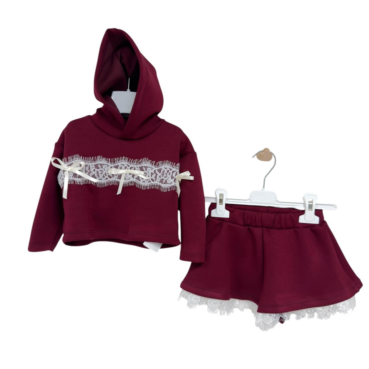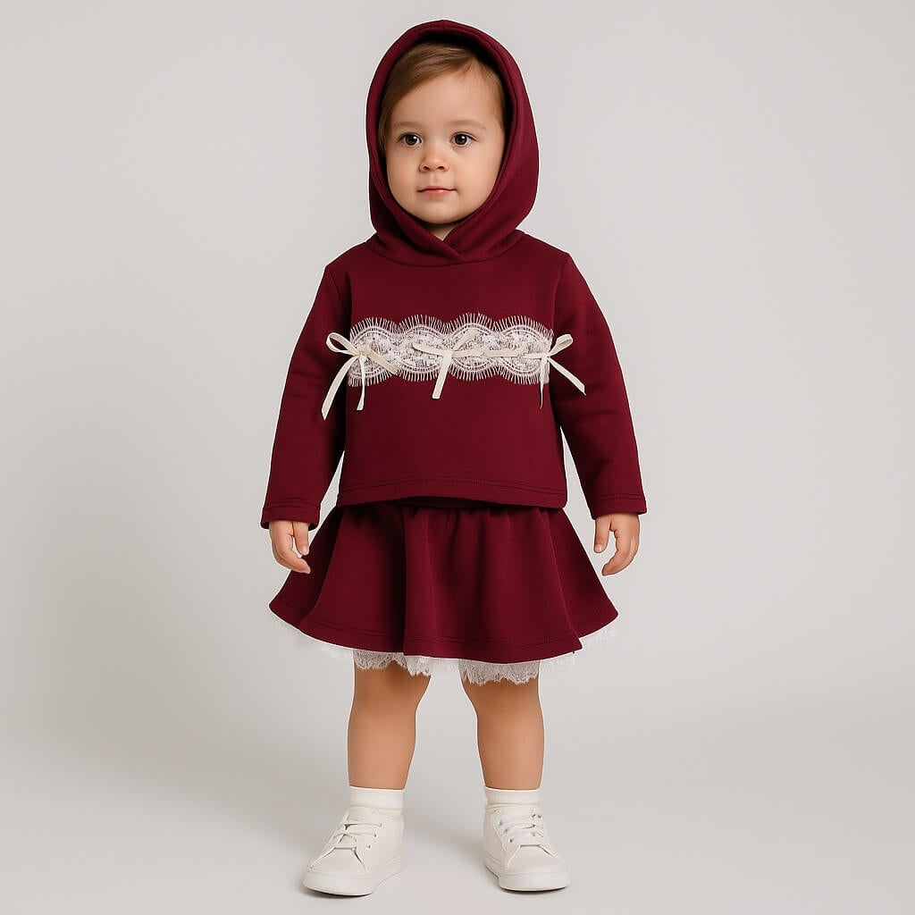 • Felpa con cappuccio decorata con inserto in pizzo e fiocchetti applicati