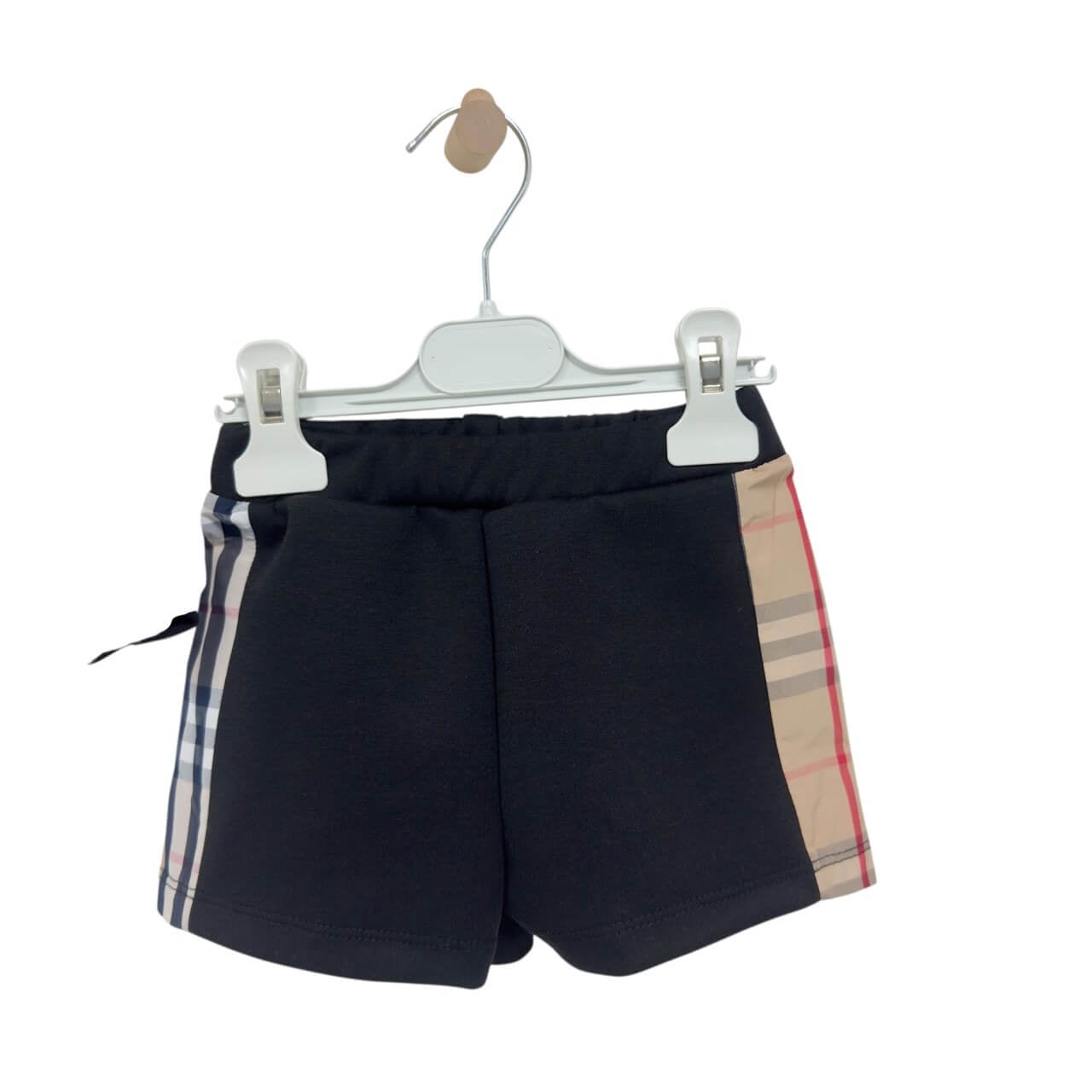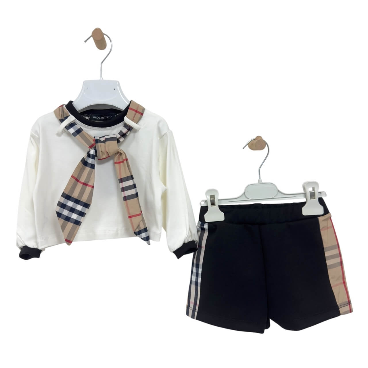 Completo neonato composto da maglia a manica lunga con elegante dettaglio a fiocco e pantaloncini abbinati. Il design presenta inserti con fantasia a quadri e polsini a contrasto per un tocco raffinato e moderno. Realizzato in morbido cotone, assicura comfort e libertà di movimento per tutto il giorno.