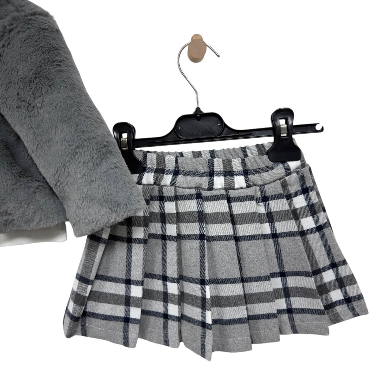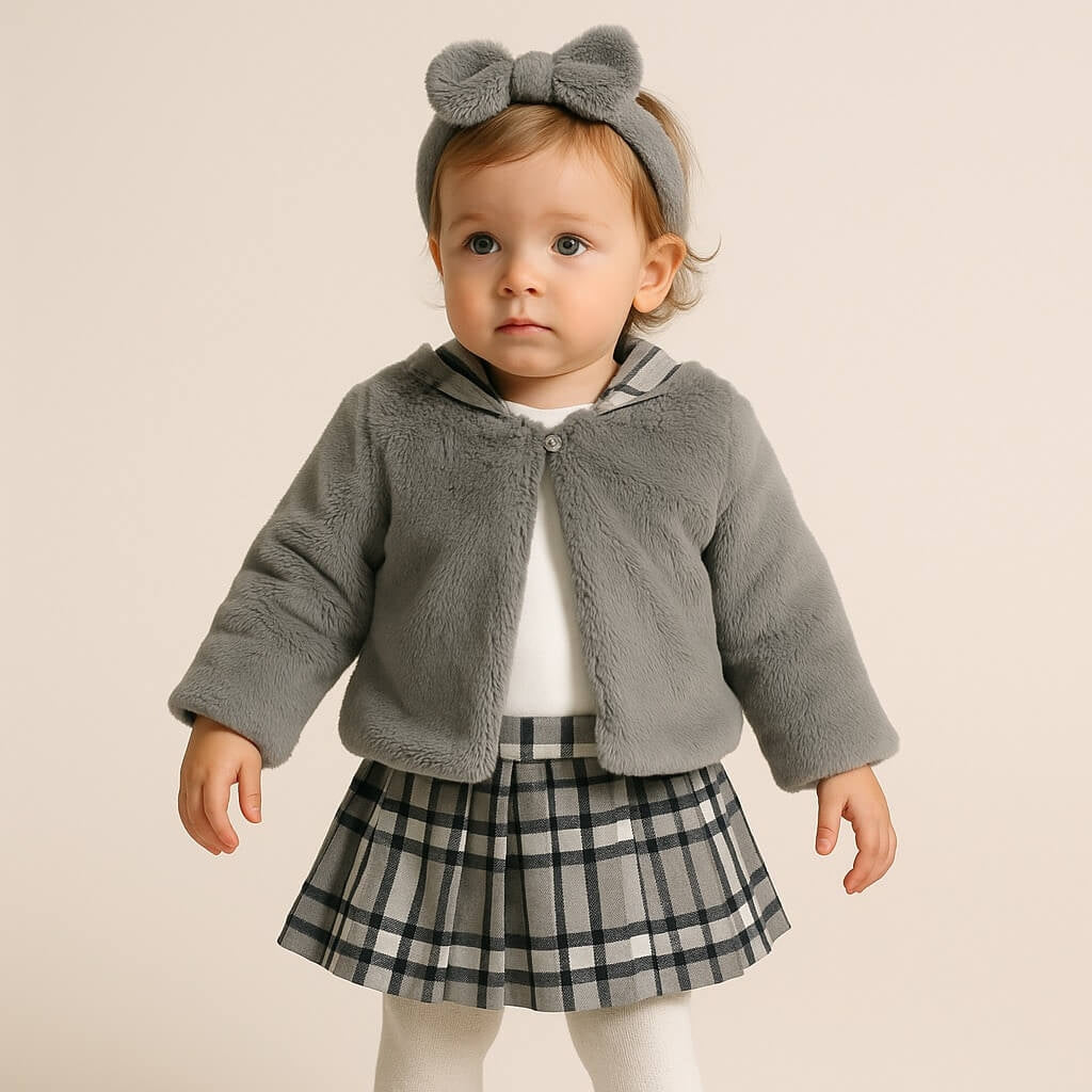 Un raffinato completo composto da maglia in caldo cotone, gonna a pieghe e giacchino in pelliccia ecologica. Un look elegante e confortevole, perfetto per le occasioni speciali e le giornate più fresche. Il set unisce morbidezza, qualità dei materiali e cura nei dettagli tipici del brand Camilla.