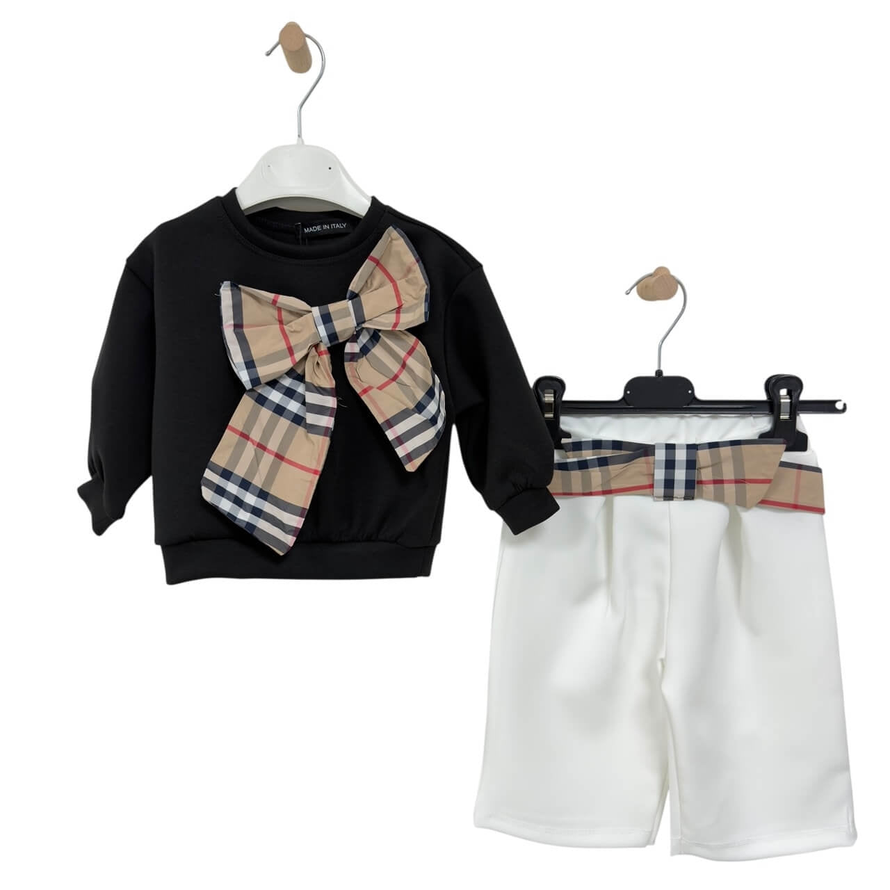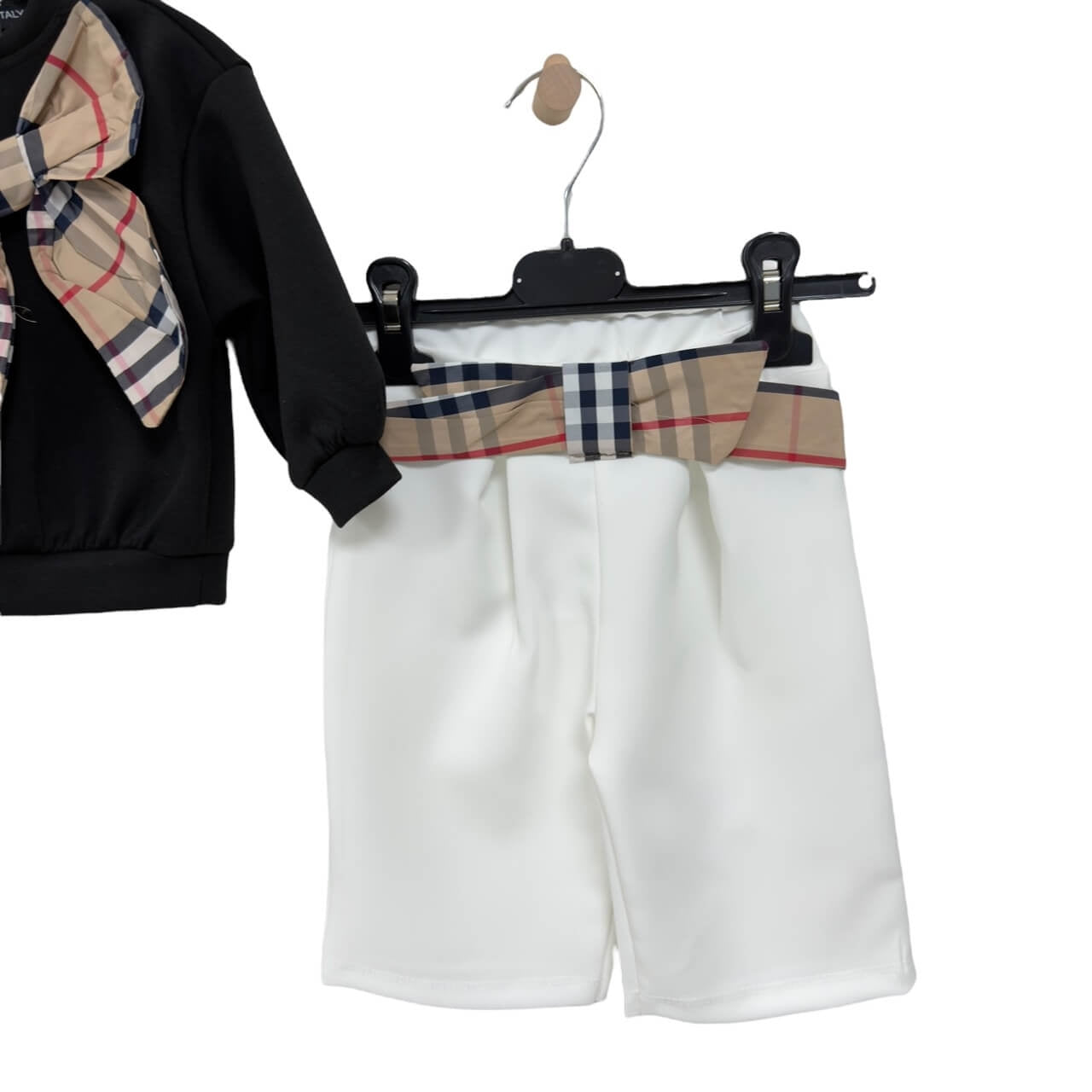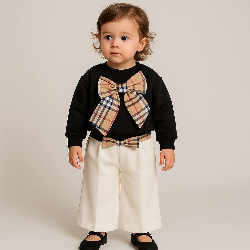 • Felpa panna a maniche lunghe con maxi fiocco applicato in fantasia check scozzese, che dona un tocco chic e raffinato.