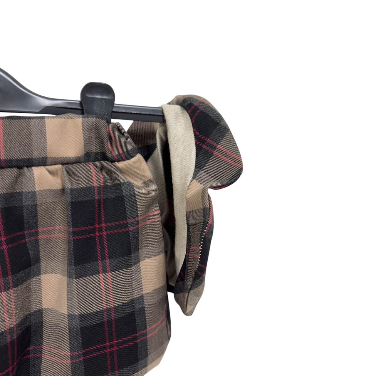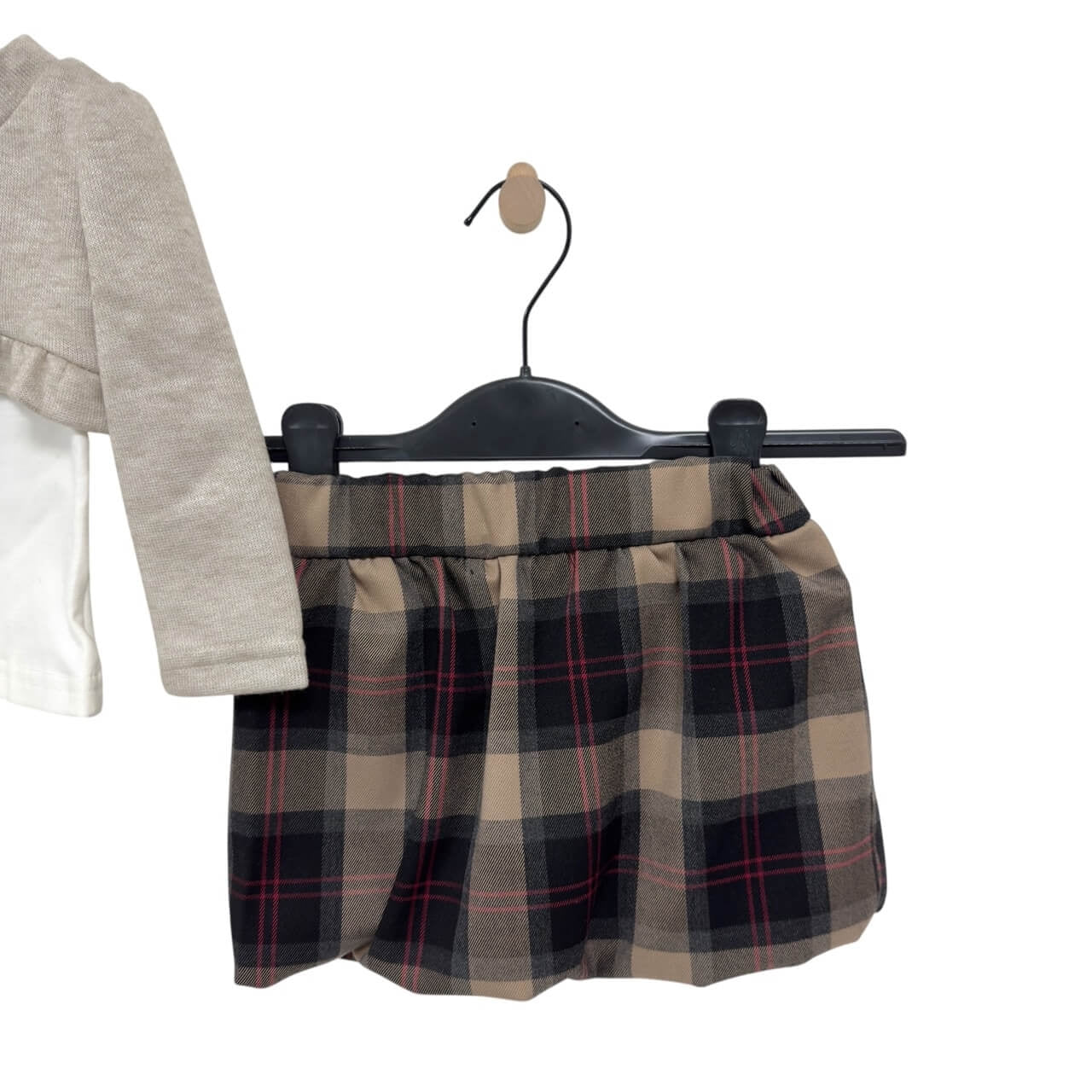 • Gonnellina scozzese nei toni del beige, nero e rosso con elastico in vita per il massimo comfort