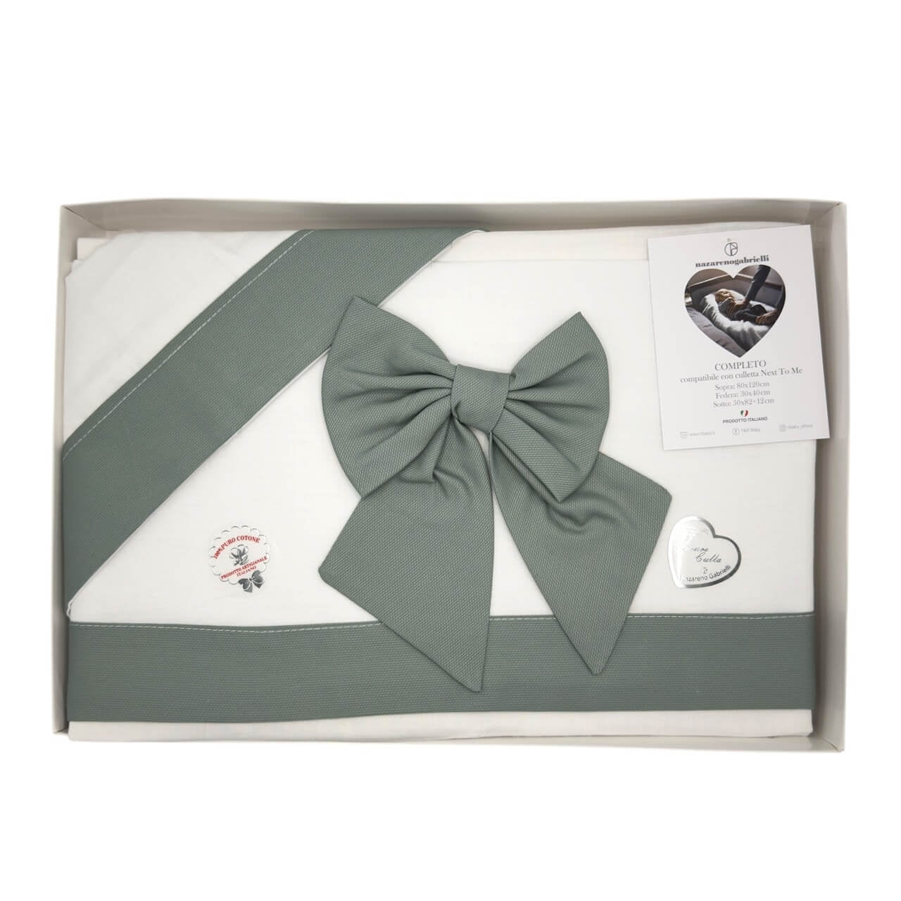 Completo lenzuola 3 pezzi in 100% puro cotone , il set lenzuola è misura maxi compatibile con le misure culla next to me. Misure: Lenzuolo sopra 80x120 cm - Sottolenzuola con angoli 50x82x12 cm - Federa cuscino 30x40 cm. Prodotto ideato, tessuto e confezionato in Italia.Il lavaggio può essere effettuato a mano o in lavatrice ad una temperatura massima che non superi i 40°C.