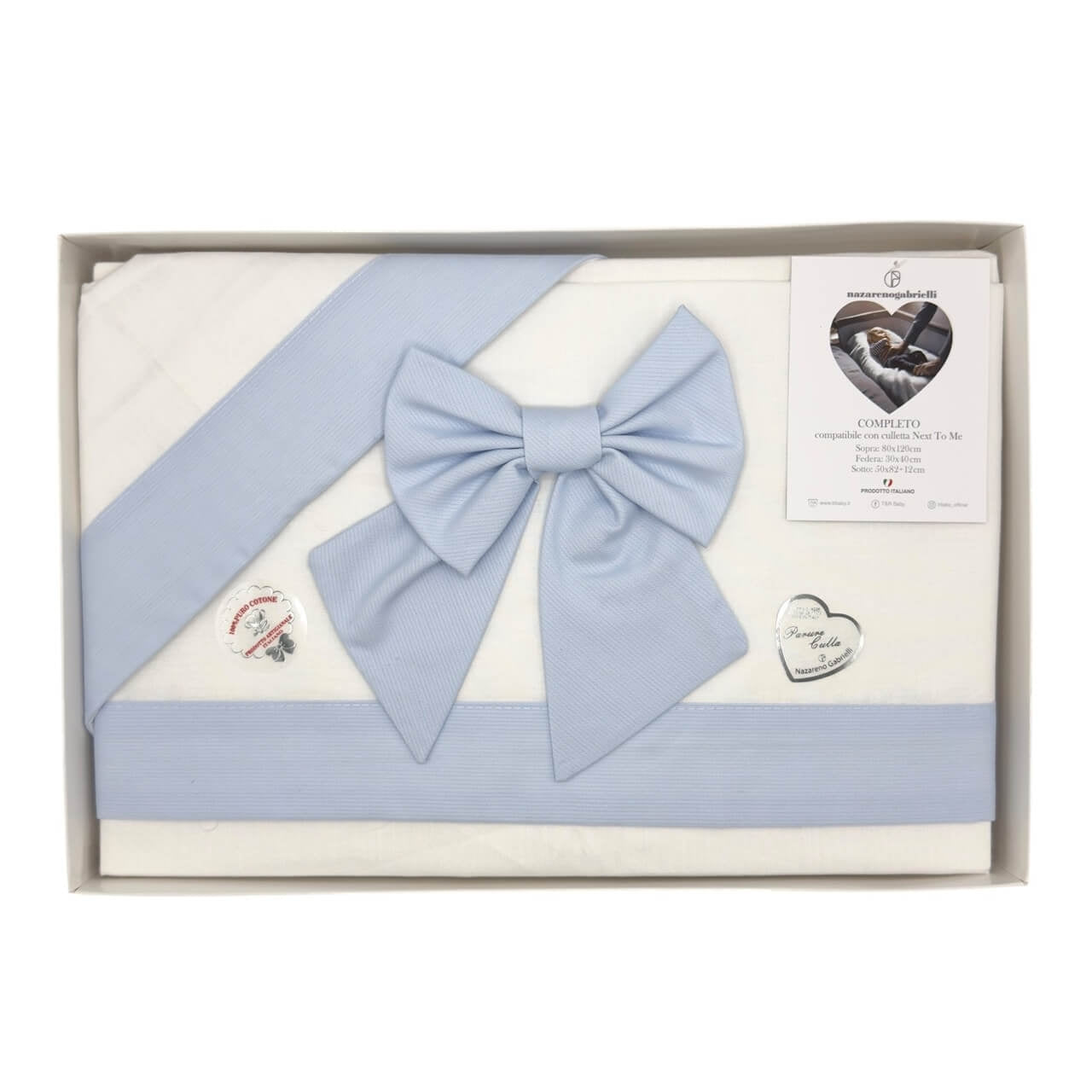 Completo lenzuola 3 pezzi in 100% puro cotone , il set lenzuola è misura maxi compatibile con le misure culla next to me. Misure: Lenzuolo sopra 80x120 cm - Sottolenzuola con angoli 50x82x12 cm - Federa cuscino 30x40 cm. Prodotto ideato, tessuto e confezionato in Italia.Il lavaggio può essere effettuato a mano o in lavatrice ad una temperatura massima che non superi i 40°C.