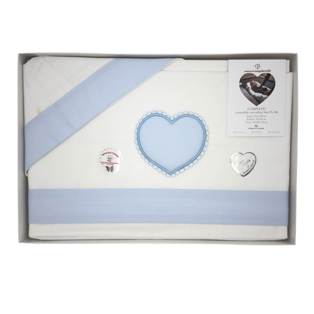 Completo lenzuola 3 pezzi in 100% puro cotone , il set lenzuola è misura maxi compatibile con le misure culla next to me. Misure: Lenzuolo sopra 80x120 cm - Sottolenzuola con angoli 50x82x12 cm - Federa cuscino 30x40 cm. Prodotto ideato, tessuto e confezionato in Italia.Il lavaggio può essere effettuato a mano o in lavatrice ad una temperatura massima che non superi i 40°C.