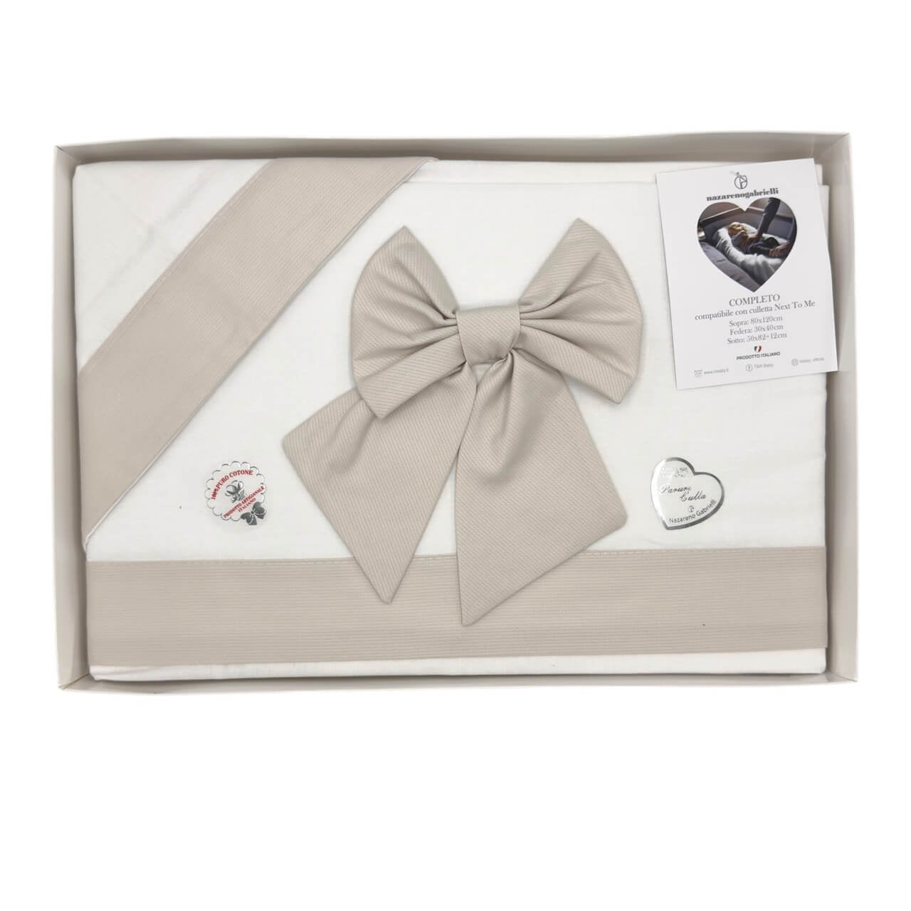Completo lenzuola 3 pezzi in 100% puro cotone , il set lenzuola è misura maxi compatibile con le misure culla next to me. Misure: Lenzuolo sopra 80x120 cm - Sottolenzuola con angoli 50x82x12 cm - Federa cuscino 30x40 cm. Prodotto ideato, tessuto e confezionato in Italia.Il lavaggio può essere effettuato a mano o in lavatrice ad una temperatura massima che non superi i 40°C.