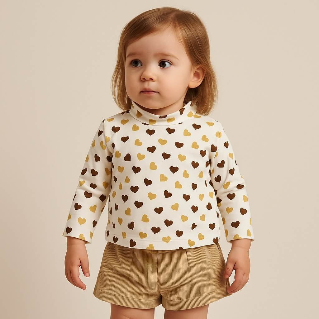 Maglia bianca a collo alto con fantasia a cuoricini nei toni del marrone e del senape, realizzata in morbido cotone elasticizzato