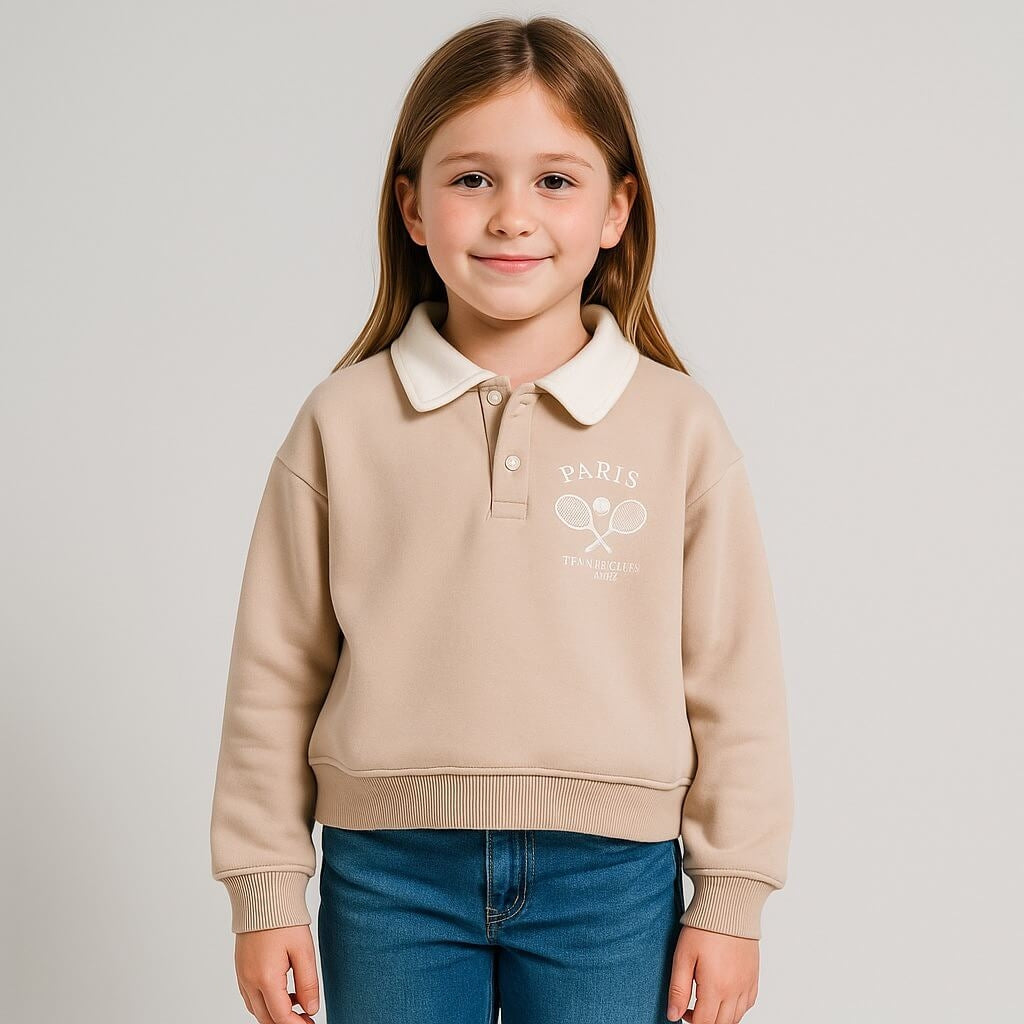 Felpa da bambina con collo polo e apertura a bottoni sul davanti. La grafica frontale presenta un motivo sportivo ispirato al tennis, con scritta decorativa e racchette stilizzate. Il modello ha vestibilità comoda, polsini e fondo a costine per un maggiore comfort. Perfetta per un look casual e alla moda, ideale per l’uso quotidiano.