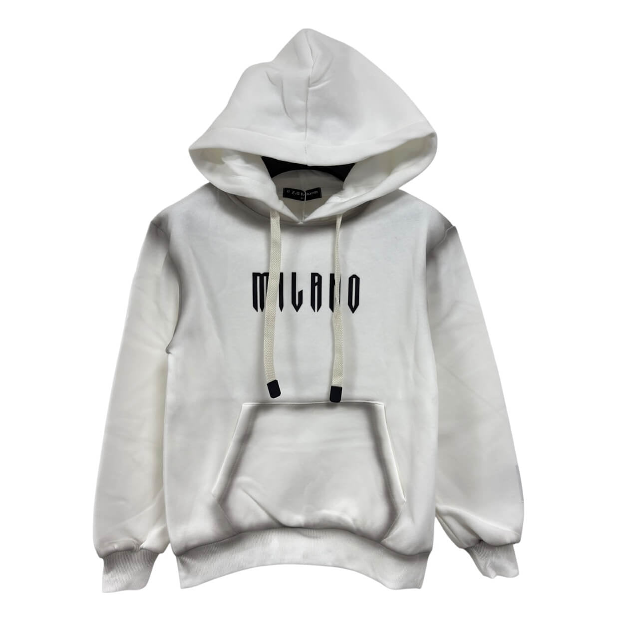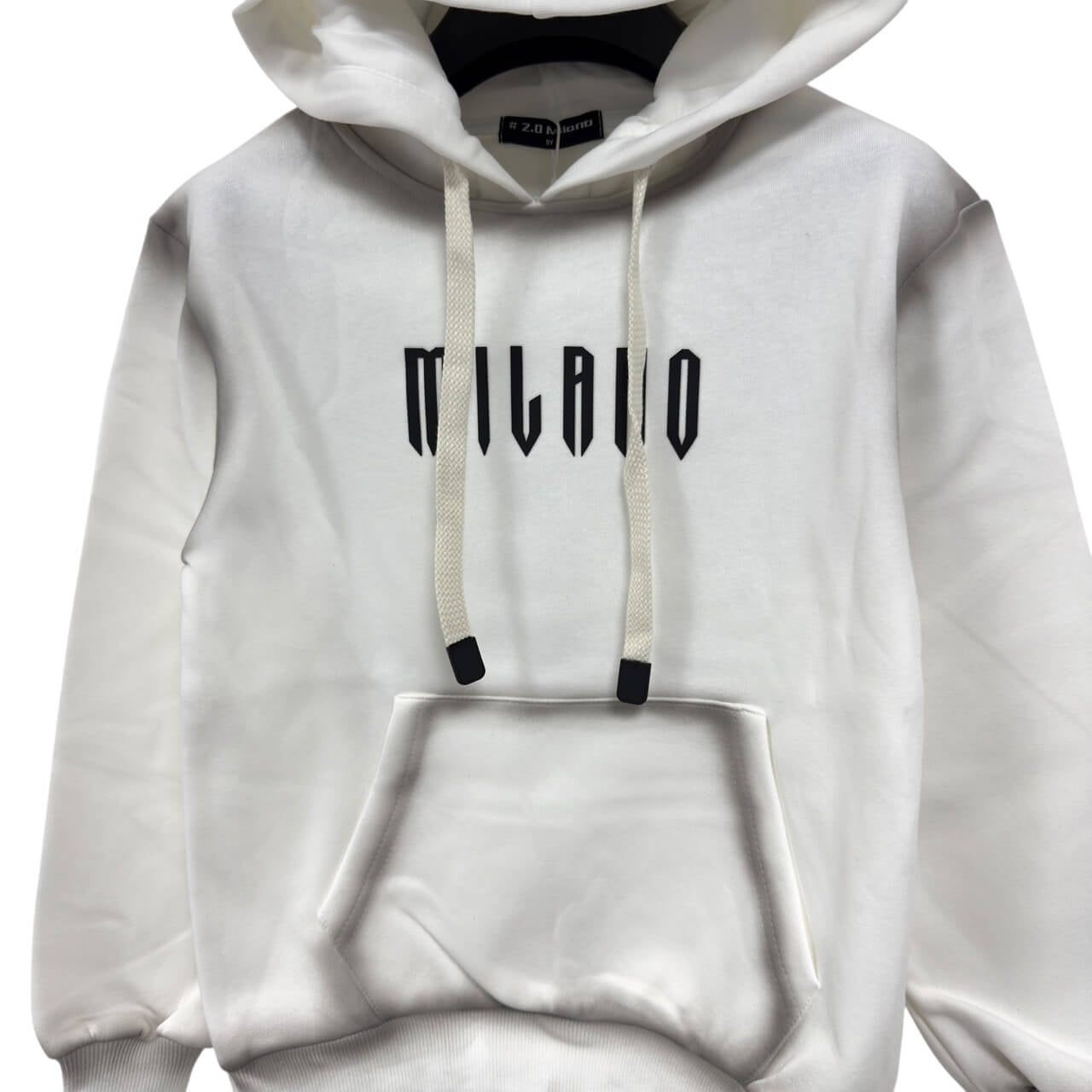 Felpa con cappuccio in cotone pesante, caratterizzata da un design moderno e dalla stampa frontale con logo MILANO. Presenta coulisse regolabili, tasca a marsupio e polsini elasticizzati per un fit comodo e casual.