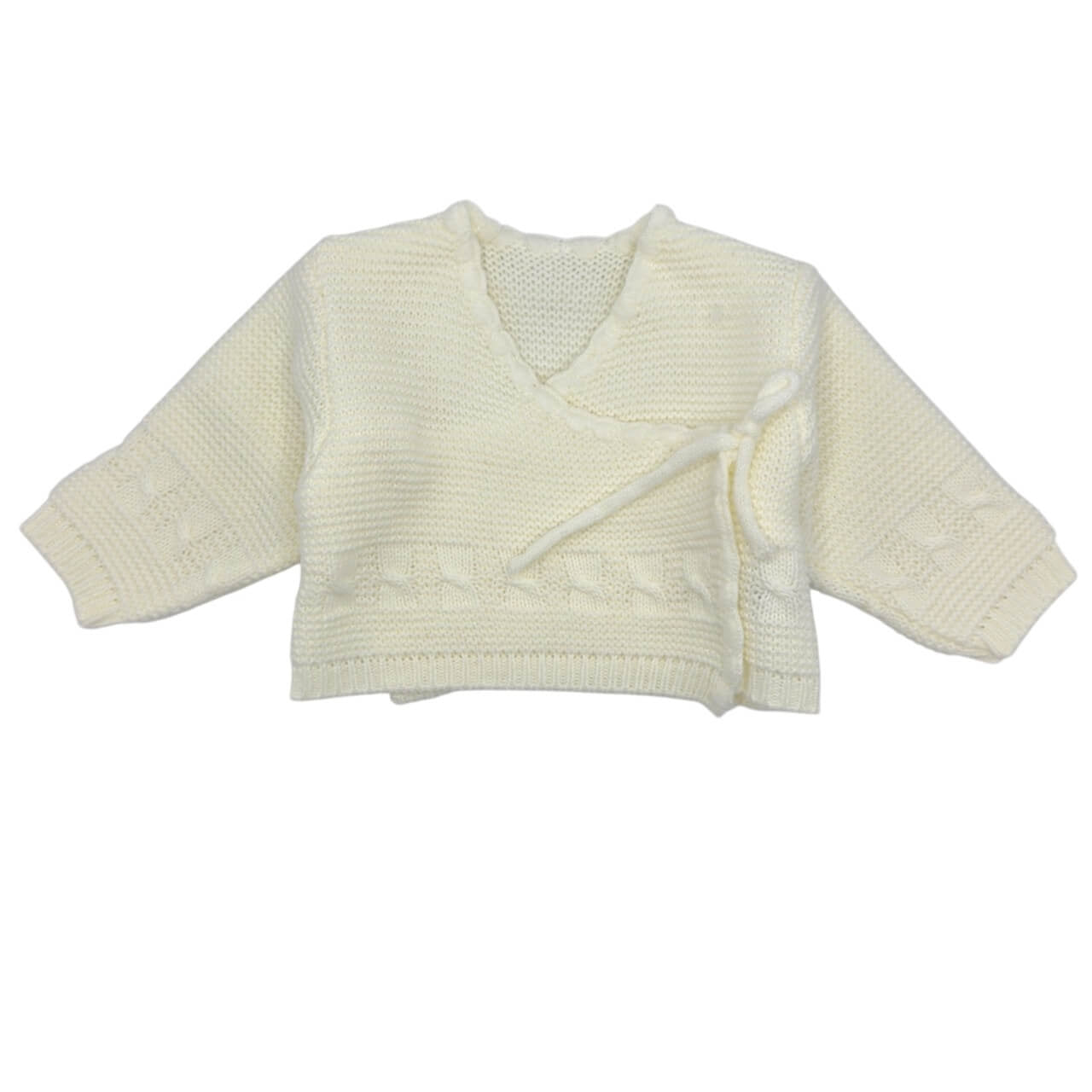 Giacchino neonato del marchio Melanie, realizzato in morbido tessuto acrilico a maglia. Modello incrociato con laccetto laterale, rifinito con dettagli lavorati e bordi elasticizzati per una vestibilità confortevole. Un capo pratico e raffinato, ideale per il corredino e perfetto per tenere il bimbo al caldo con stile.