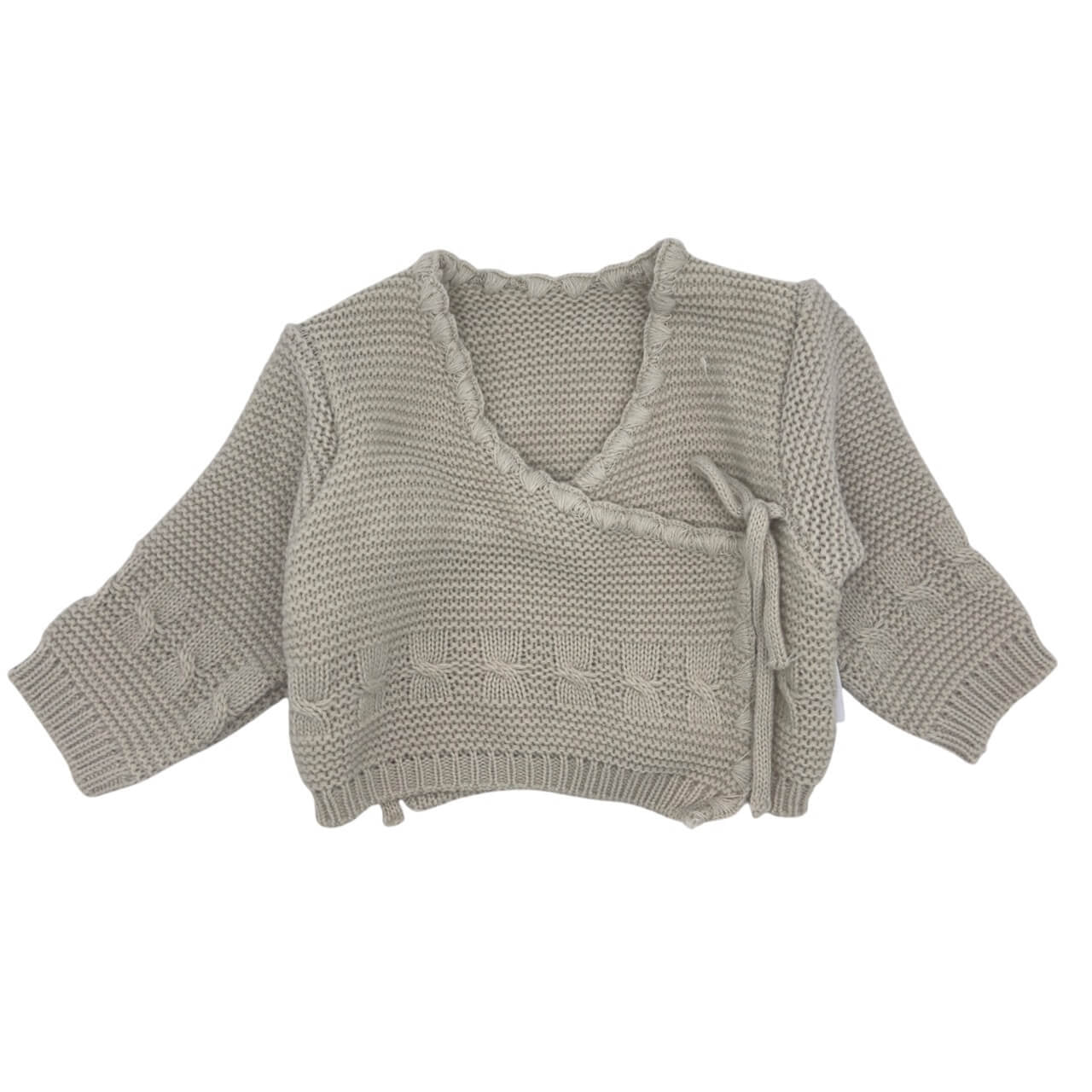 Giacchino neonato del marchio Melanie, realizzato in morbido tessuto acrilico a maglia. Modello incrociato con laccetto laterale, rifinito con dettagli lavorati e bordi elasticizzati per una vestibilità confortevole. Un capo pratico e raffinato, ideale per il corredino e perfetto per tenere il bimbo al caldo con stile.