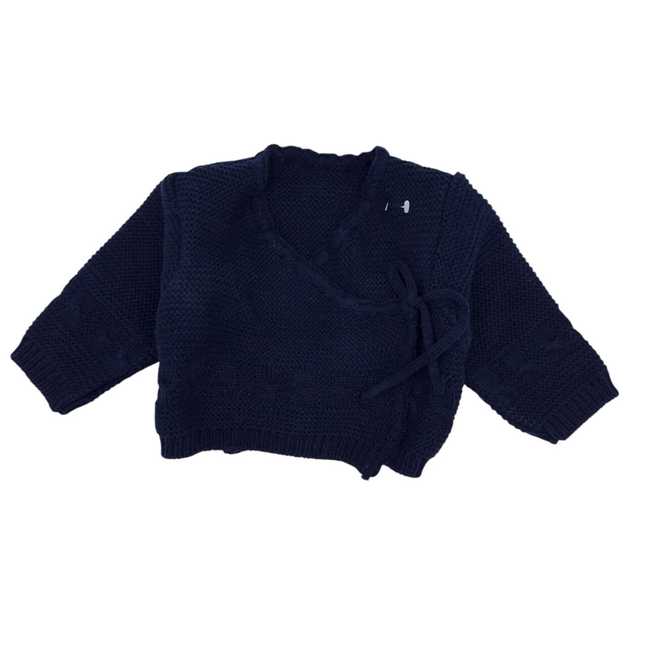 Giacchino neonato del marchio Melanie, realizzato in morbido tessuto acrilico a maglia. Modello incrociato con laccetto laterale, rifinito con dettagli lavorati e bordi elasticizzati per una vestibilità confortevole. Un capo pratico e raffinato, ideale per il corredino e perfetto per tenere il bimbo al caldo con stile.
