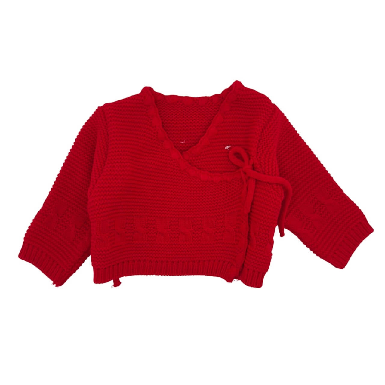 Giacchino neonato del marchio Melanie, realizzato in morbido tessuto acrilico a maglia. Modello incrociato con laccetto laterale, rifinito con dettagli lavorati e bordi elasticizzati per una vestibilità confortevole. Un capo pratico e raffinato, ideale per il corredino e perfetto per tenere il bimbo al caldo con stile.