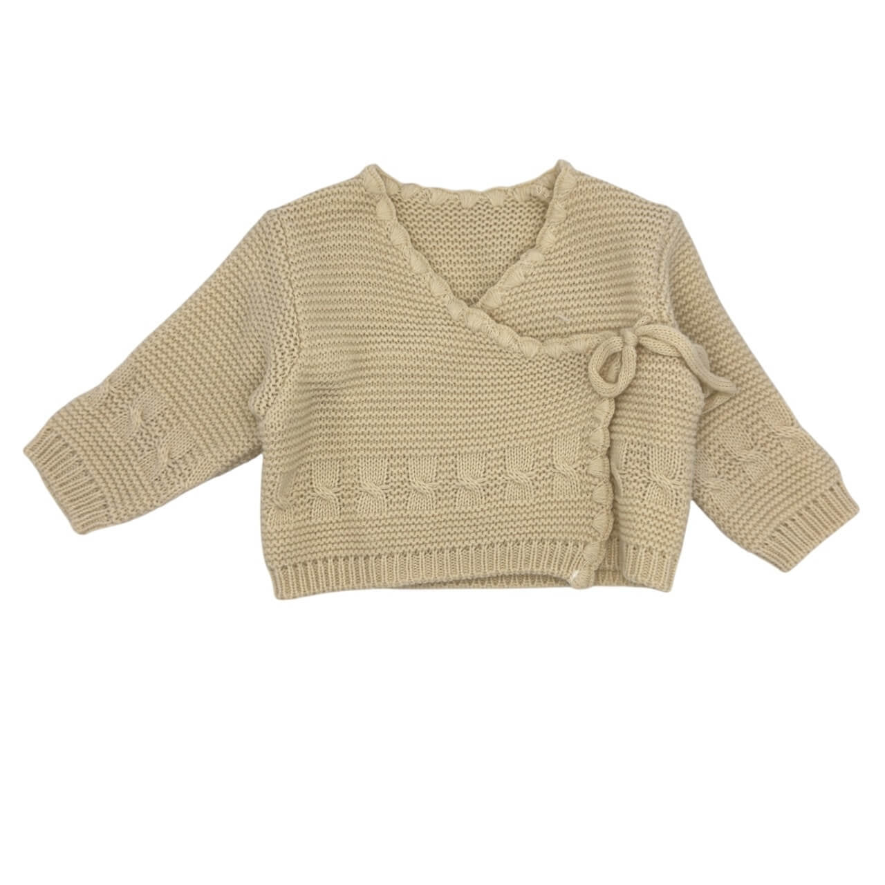 Giacchino neonato del marchio Melanie, realizzato in morbido tessuto acrilico a maglia. Modello incrociato con laccetto laterale, rifinito con dettagli lavorati e bordi elasticizzati per una vestibilità confortevole. Un capo pratico e raffinato, ideale per il corredino e perfetto per tenere il bimbo al caldo con stile.