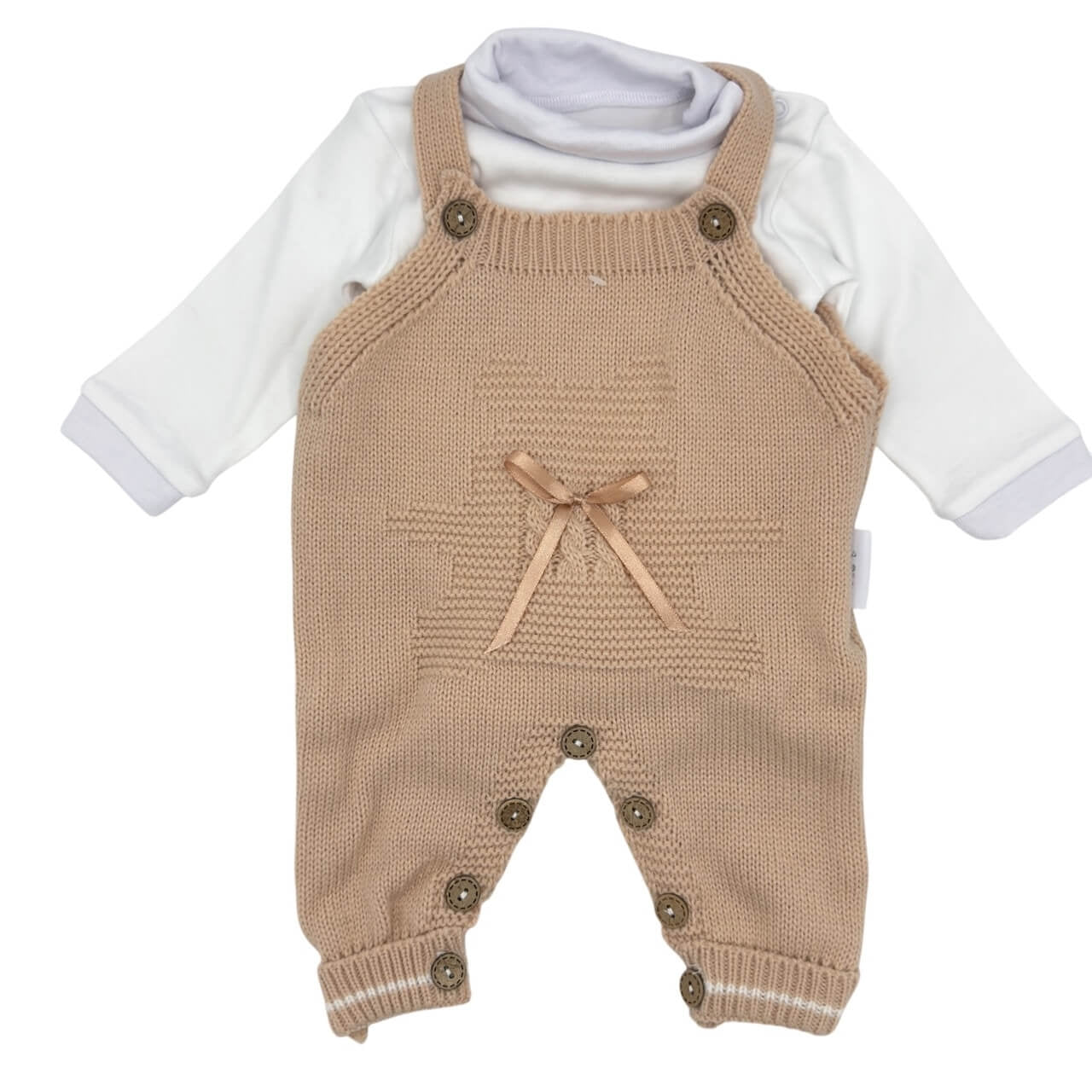 Completo neonato del marchio Melanie, disponibile nelle taglie 1-3 e 3-6 mesi. Realizzato in morbido tessuto acrilico, è composto da salopette lavorata a maglia con dettagli raffinati e bottoncini pratici, abbinata a un bodino a maniche lunghe in cotone. Confezionato in elegante scatola, è una scelta ideale per corredino o come idea regalo.