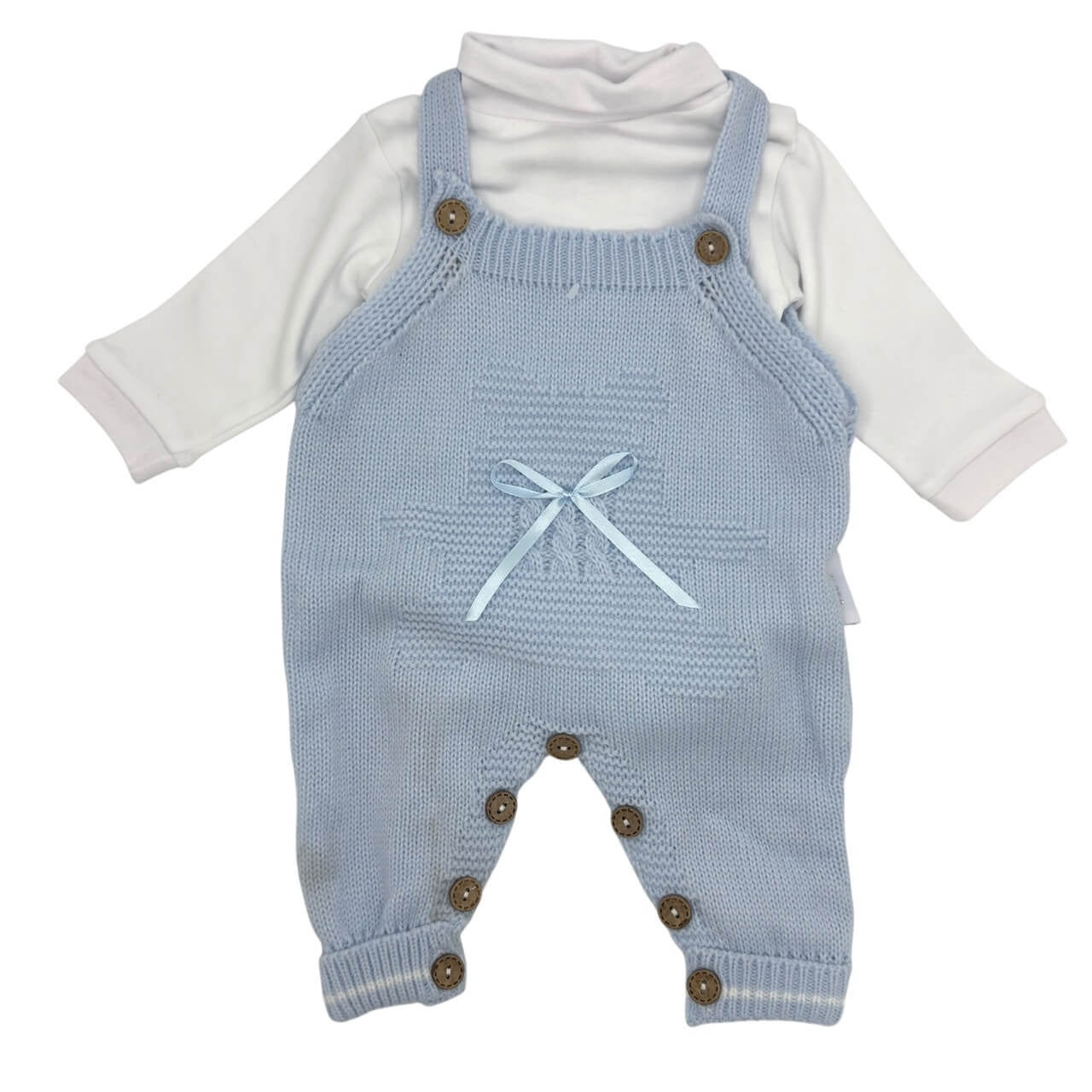 Completo neonato del marchio Melanie, disponibile nelle taglie 1-3 e 3-6 mesi. Realizzato in morbido tessuto acrilico, è composto da salopette lavorata a maglia con dettagli raffinati e bottoncini pratici, abbinata a un bodino a maniche lunghe in cotone. Confezionato in elegante scatola, è una scelta ideale per corredino o come idea regalo.