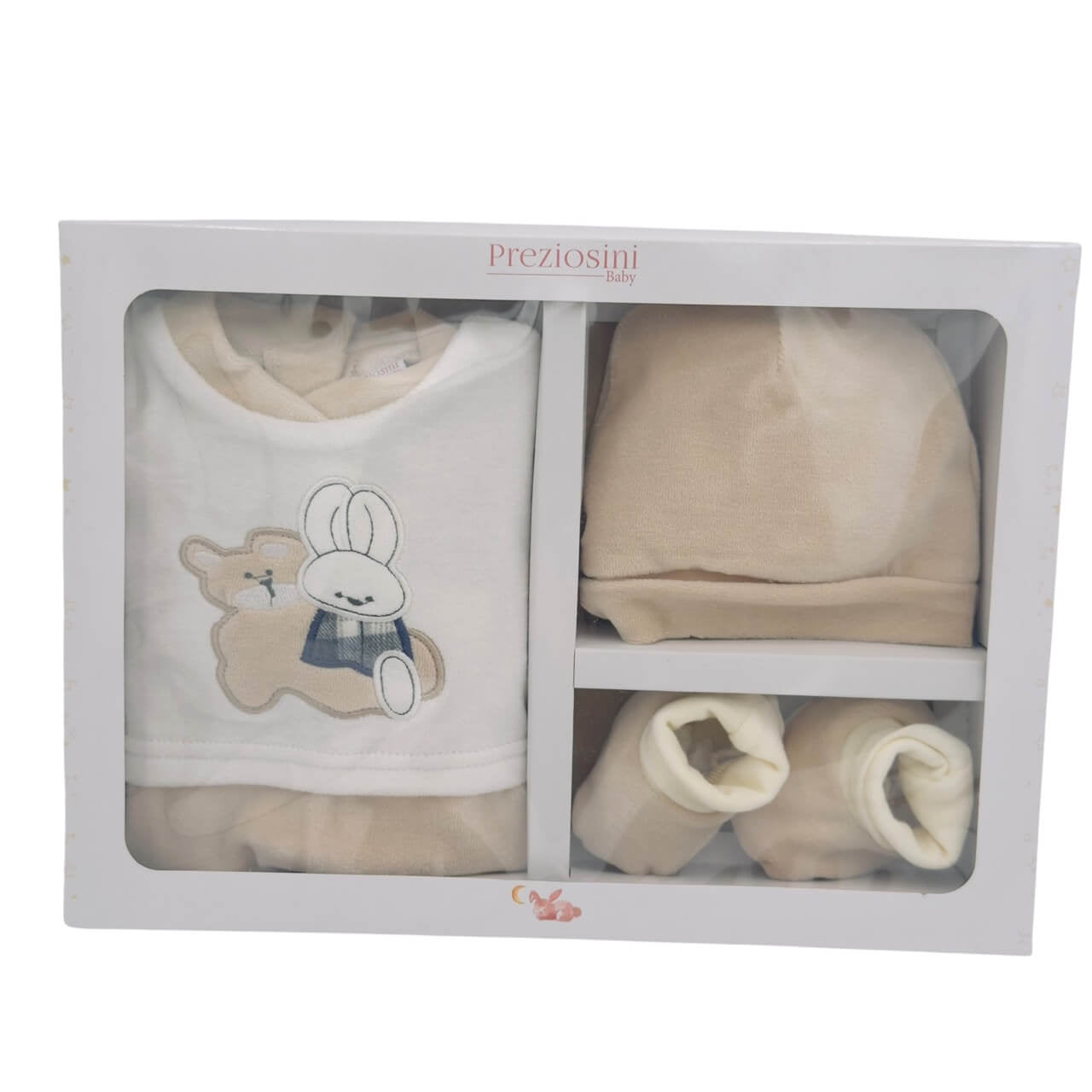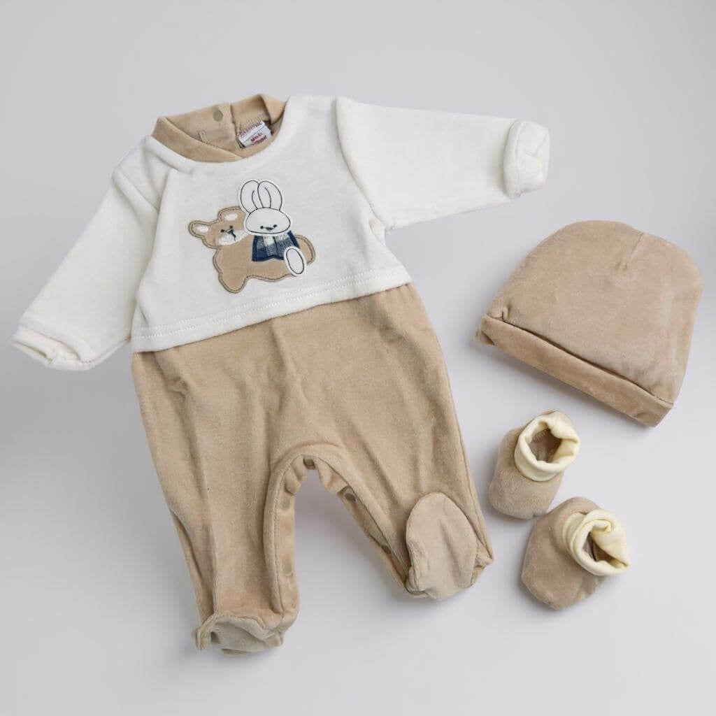 Delizioso set composto da una tutina in morbida ciniglia, abbinata a un cappellino e un paio di scarpine coordinati. Ideale per offrire comfort e calore al tuo bambino fin dai primi giorni, questo completo firmato Batuffolini è perfetto per le uscite o come idea regalo. I dettagli curati e le rifiniture eleganti ne fanno una scelta raffinata e versatile.