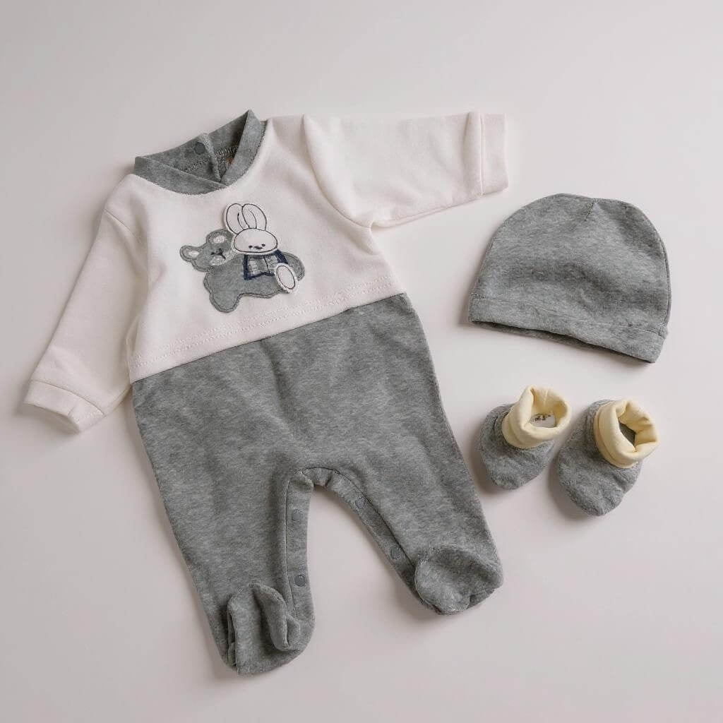 Delizioso set composto da una tutina in morbida ciniglia, abbinata a un cappellino e un paio di scarpine coordinati. Ideale per offrire comfort e calore al tuo bambino fin dai primi giorni, questo completo firmato Batuffolini è perfetto per le uscite o come idea regalo. I dettagli curati e le rifiniture eleganti ne fanno una scelta raffinata e versatile.