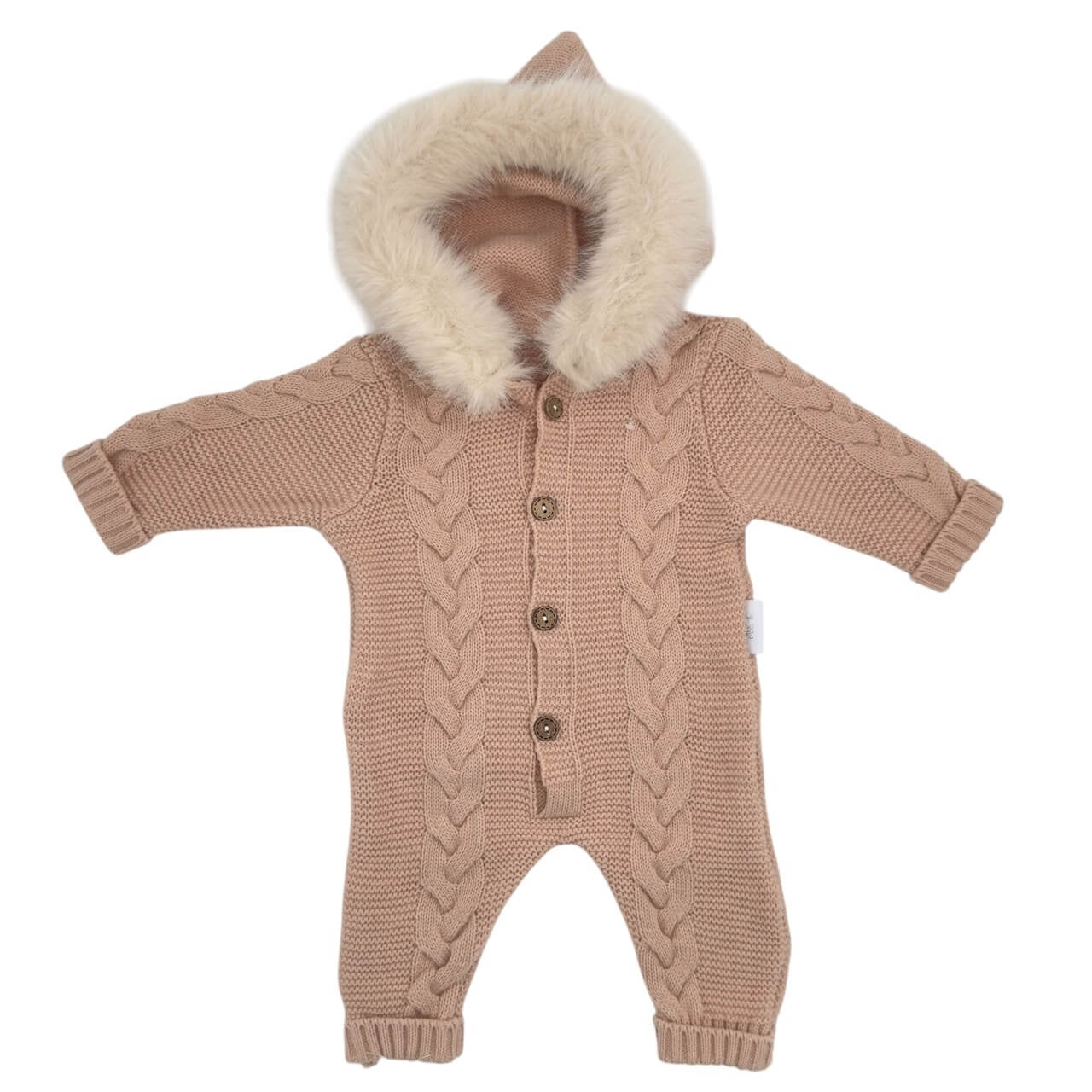 Tutone neonato firmato Melanie, realizzato in morbido tessuto acrilico lavorato a maglia con motivo treccia. Dotato di cappuccio con bordo peloso, chiusura frontale con bottoni e polsini a coste per garantire comfort e protezione. Un capo caldo e pratico, ideale per le giornate più fredde e perfetto come regalo elegante e funzionale.