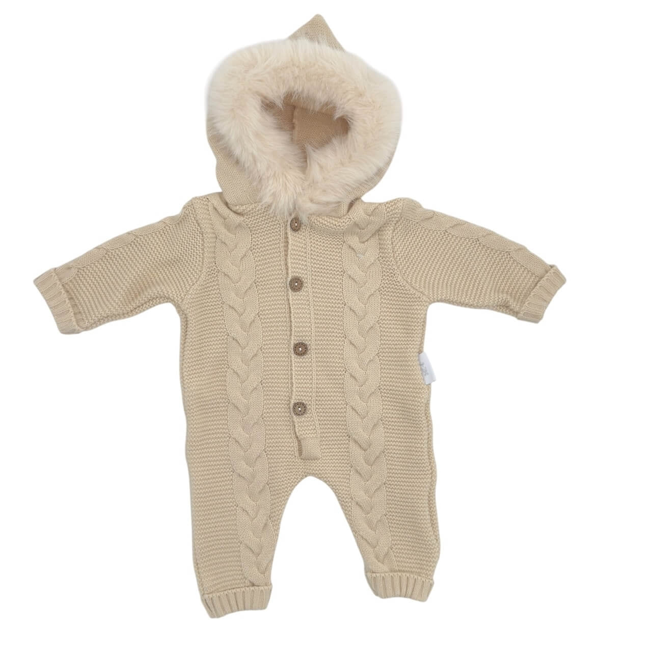 Tutone neonato firmato Melanie, realizzato in morbido tessuto acrilico lavorato a maglia con motivo treccia. Dotato di cappuccio con bordo peloso, chiusura frontale con bottoni e polsini a coste per garantire comfort e protezione. Un capo caldo e pratico, ideale per le giornate più fredde e perfetto come regalo elegante e funzionale.