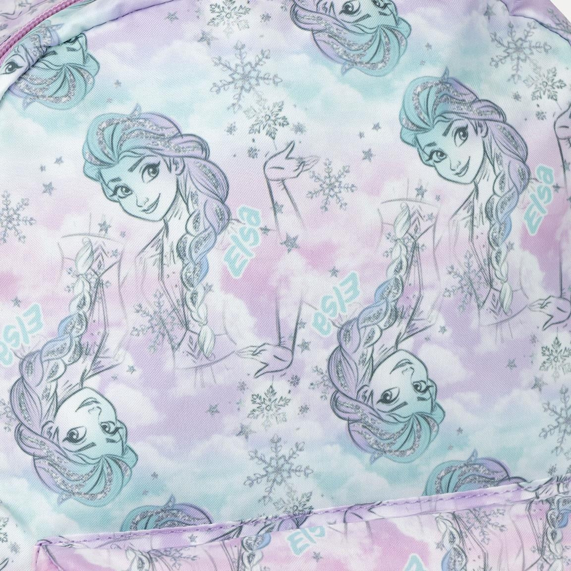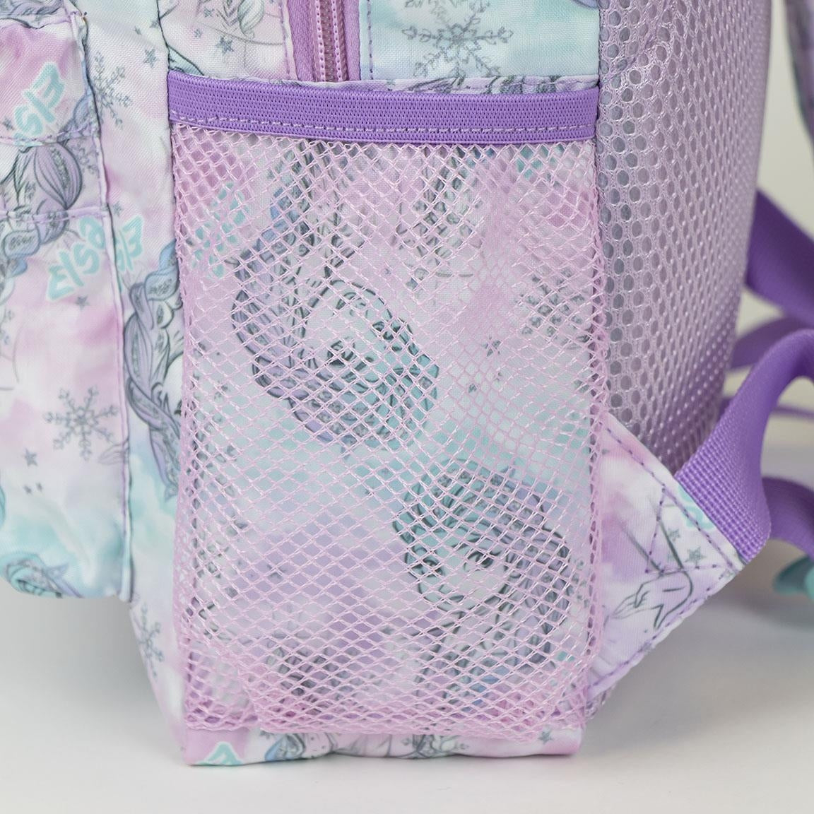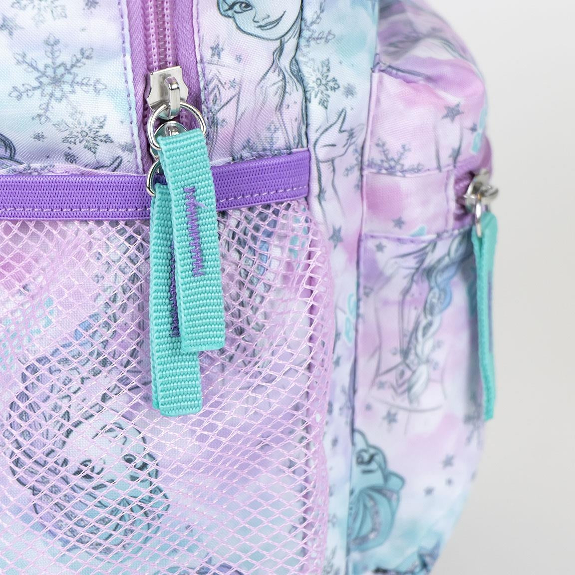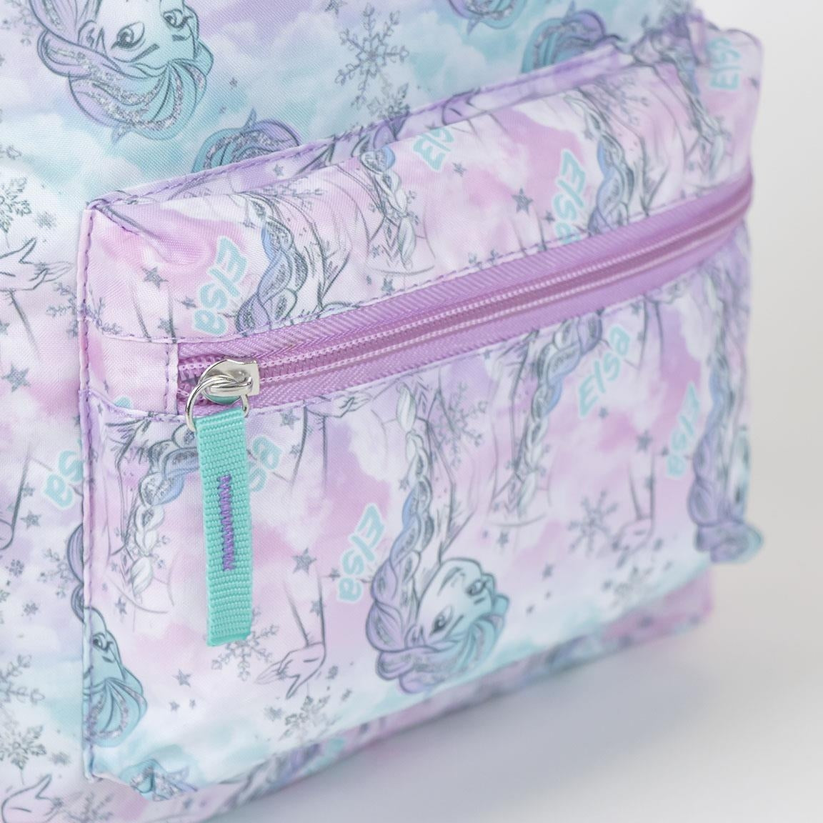 Zaino compatto e leggero, perfetto per il tempo libero o per le prime esperienze scolastiche. Decorato con un pattern integrale di Elsa in tonalità lilla, rosa e azzurro, unisce funzionalità e stile.